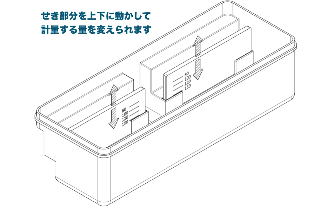 計量穴を持つ容器のように残りが少量の場合は取り出せない、といったこともなく、最後の一本まで計量みぞに入れて計量ができます。