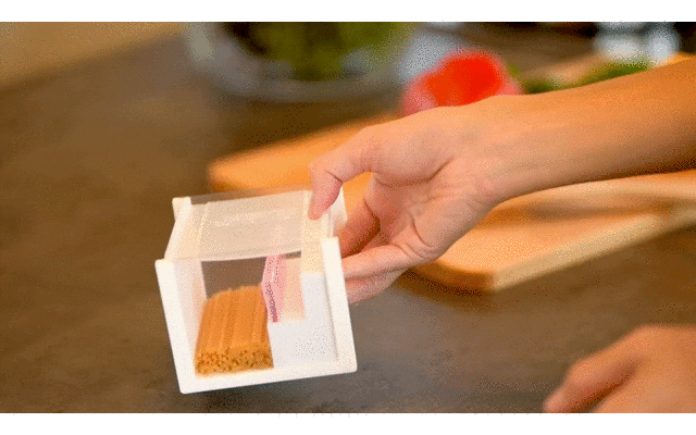 本製品を手前・向こうと2回傾けるだけで容器内に所定量(たとえば100g)が束になった状態になります。あとは蓋をあけて束をつまみ出すだけです。