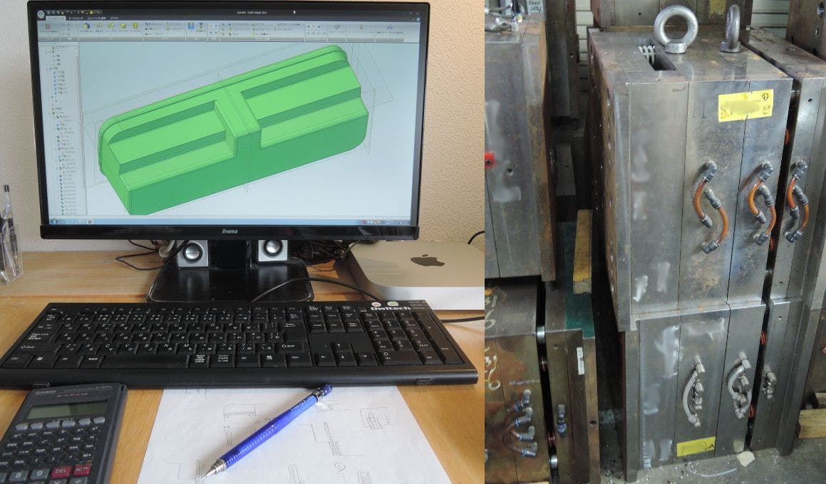 この金型設計は株式会社ヒノタマデザインが設計およびデータ作成を行い、本製品を量産していただける弘徳プラスチック工業株式会社様にて検図や助言をいただいております。(注記:本ページの試作品および図は概念モデルであり、金型抜き勾配・曲面等は考慮していません)