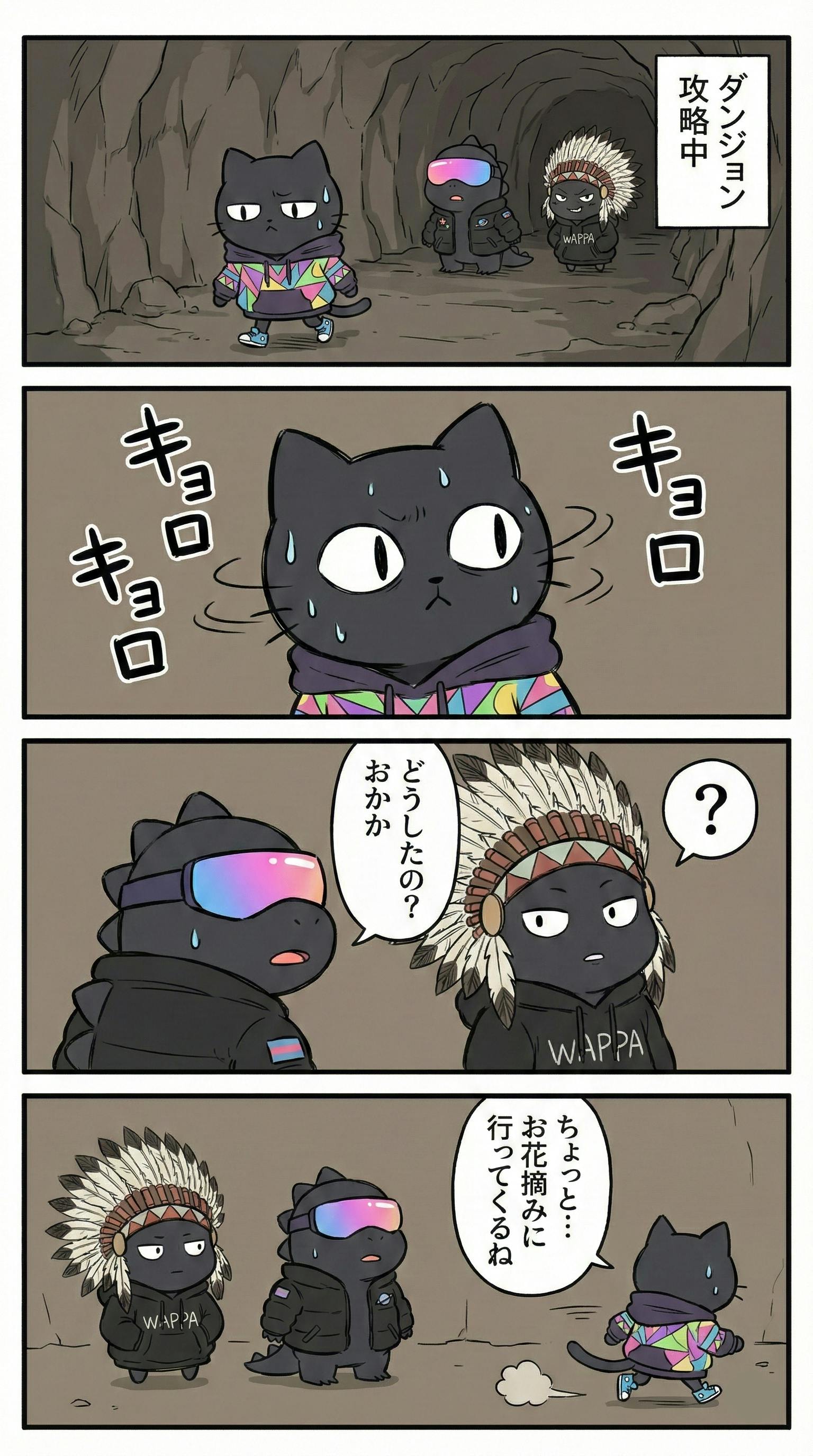 現在、キャラ立ちを強化するための「4コマ漫画」を鋭意制作中です。 おかか、はかせ、しゅうちょうの3人が、ダンジョン内で「お花摘み(AFK)」に走るような、クスッと笑える日常をお届けします。