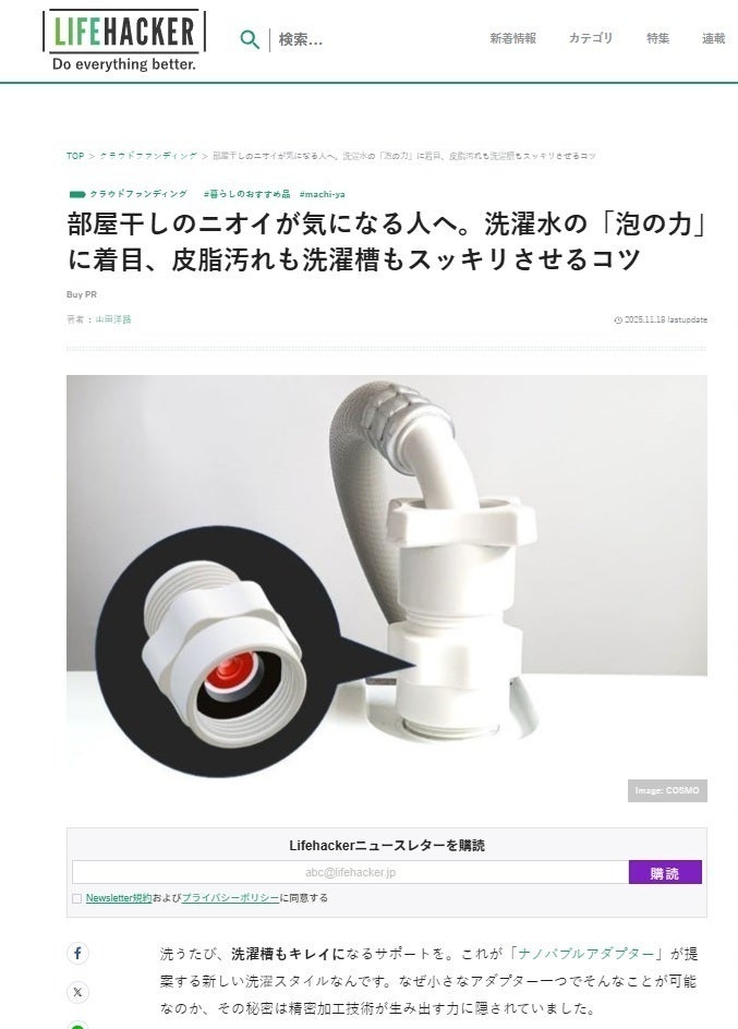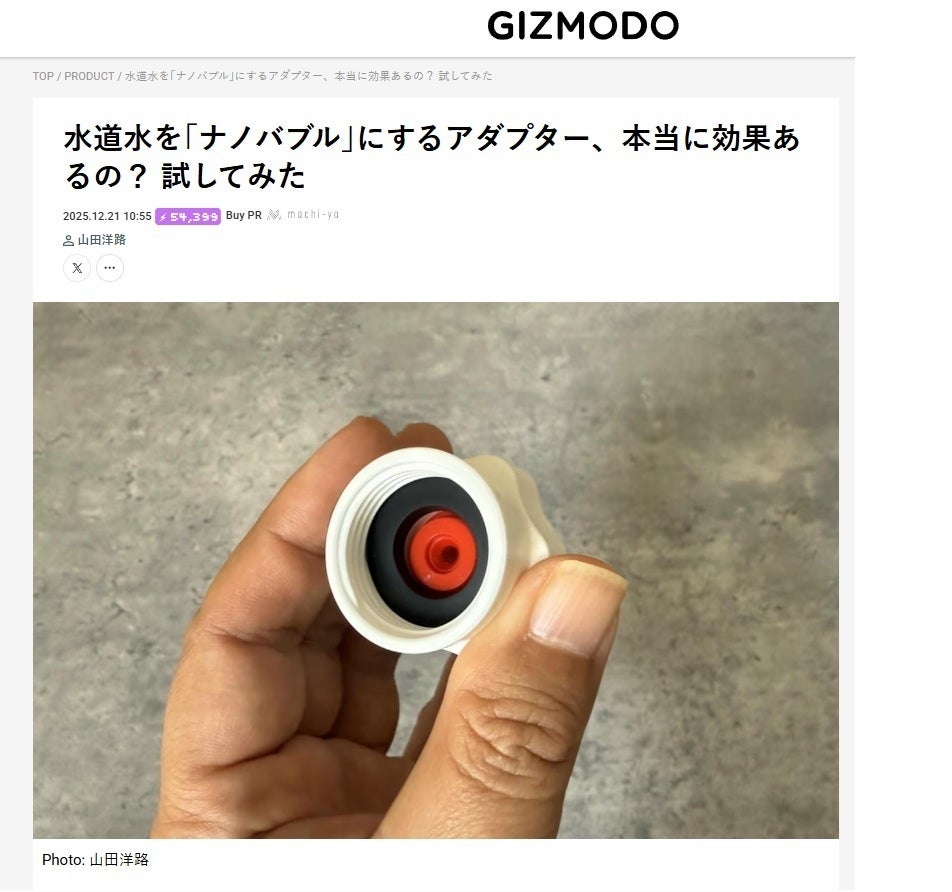 皆様おかげさまで、本プロジェクトは開始から約1ヶ月で100人を超える方々にご支援いただき、さらに現在200名以上の仲間が集まるプロジェクトへと成長しました。心より御礼申し上げます。そしてこの度、ギズモード・ジャパン様に本プロジェクトをご紹介いただきました!家庭でも手軽にナノバブルを体験できる革新性や、洗浄力・消臭力の実感について丁寧にレビューしていただき、大きな励みとなっています。▼掲載記事はこちらhttps://www.gizmodo.jp/2025/12/machi-ya-cosmobub-review-897753.html記事では、- 工具不要で5分で取り付けられる手軽さ- 皮脂汚れや食べこぼし汚れへの効果- 部屋干し臭の軽減- 洗濯槽のキレイさ維持への期待などが実際の検証を通して紹介されています。皆様からの応援が、こうしたメディア掲載や広がりにつながっています。引き続き、より良い体験をお届けできるよう全力で取り組んでまいります。今後ともどうぞよろしくお願いいたします。