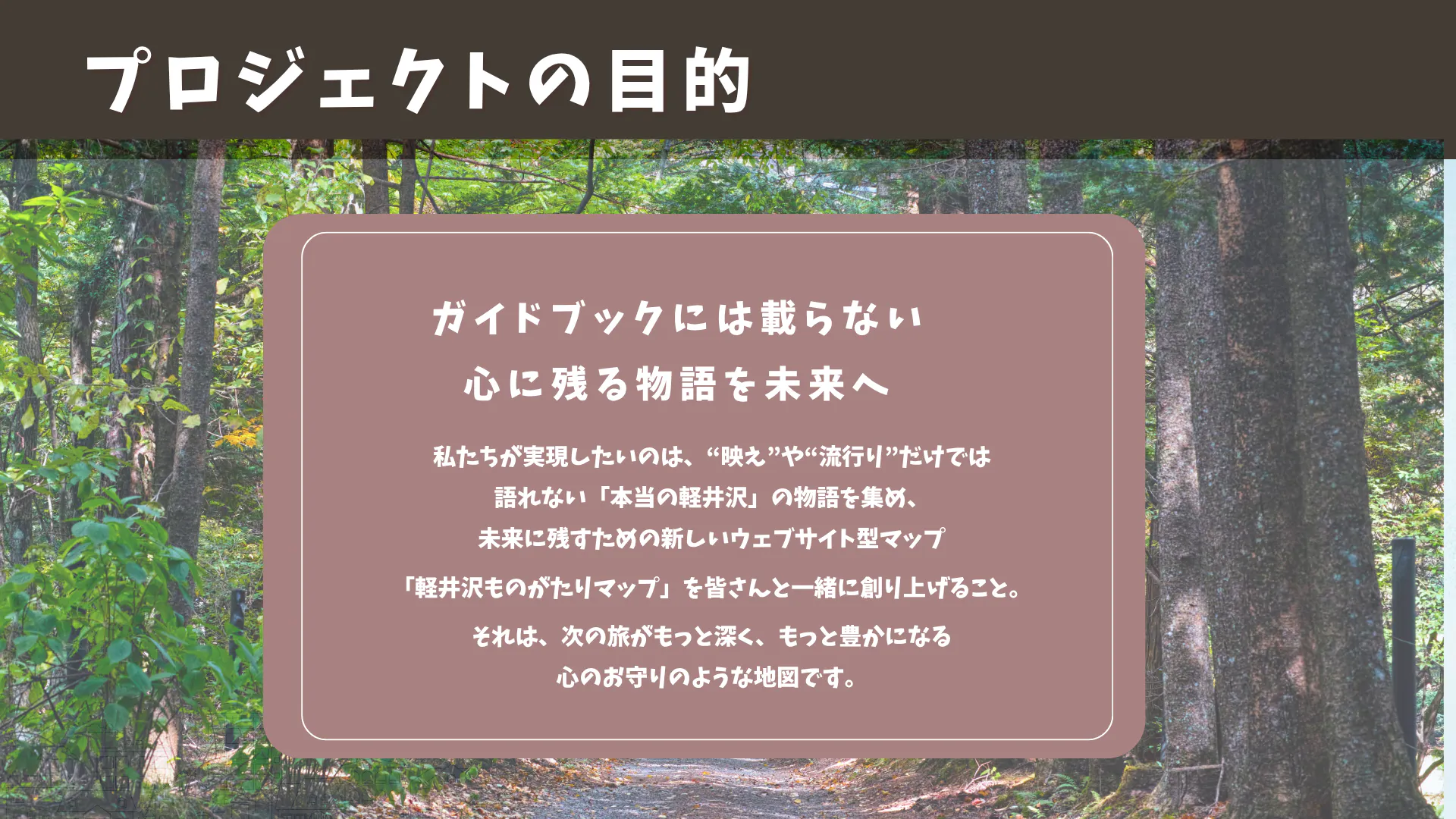 “映え”や“流行り”だけでは語れない「本当の軽井沢」の物語を集め、未来にのこすための新しいウェブサイト型マップ「軽井沢ものがたりマップ」を、皆さんと一緒に創り上げることです。