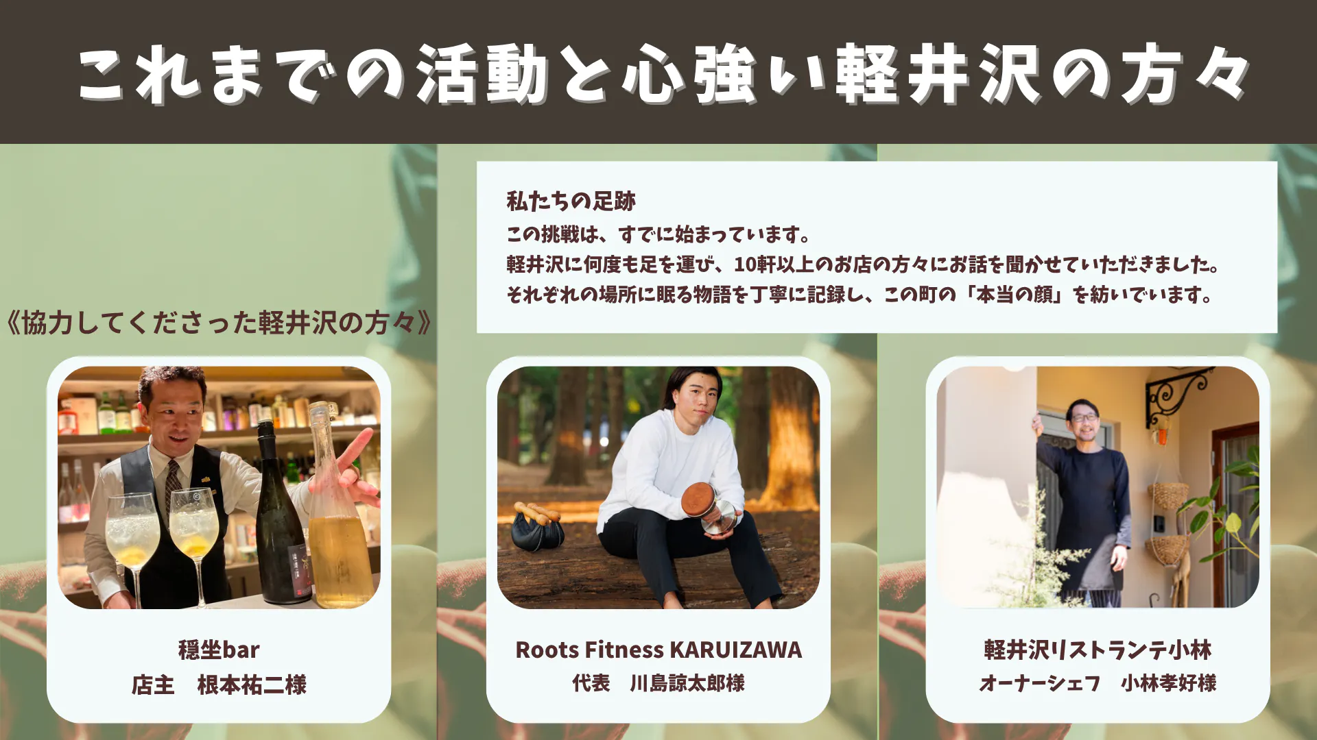 この無謀とも思える挑戦ですが、私たちはすでに行動を始めています。軽井沢に何度も足を運び、10軒以上のお店の方々にお話を聞かせていただきました。そして、私たちの想いに共感し、力を貸してくださる心強い先輩たちとも出会うことができました。