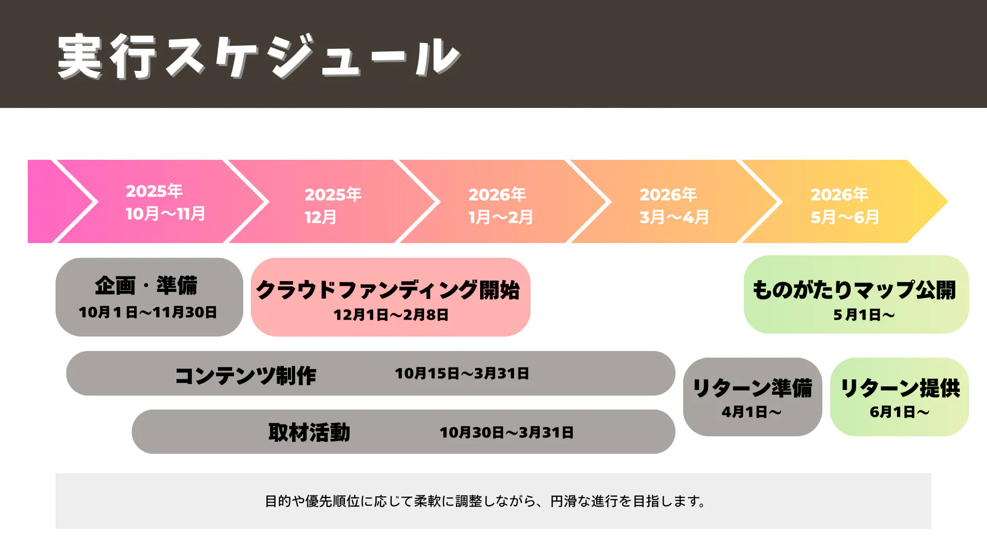 皆さまの応援を力に、以下のスケジュールでプロジェクトを着実に実行していきます。