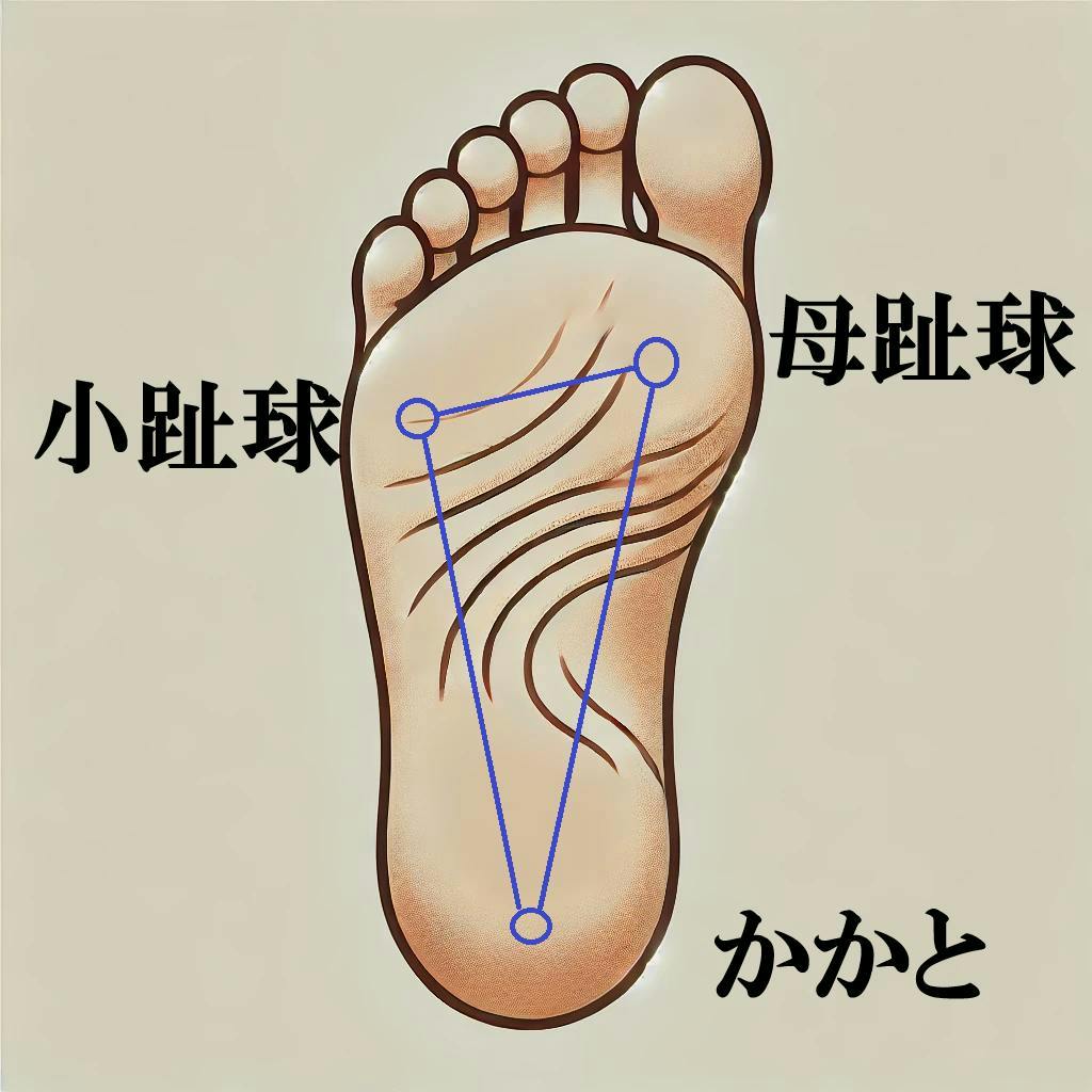 私たちの足は、かかと・母趾球(親指の付け根)・小趾球(小指の付け根)を結ぶ「三点バランス」 によって支えられています。