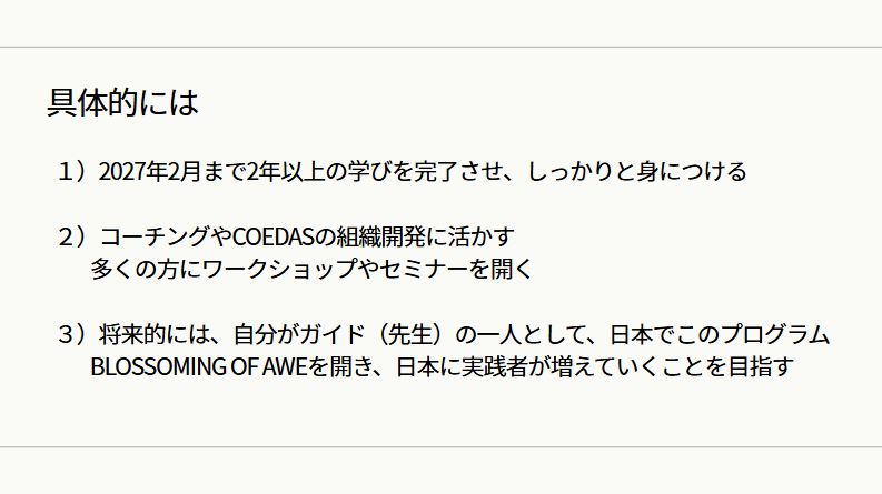 ・将来的な目標は、日本で、日本語で、このBlossoming of Aweを実施する事です。