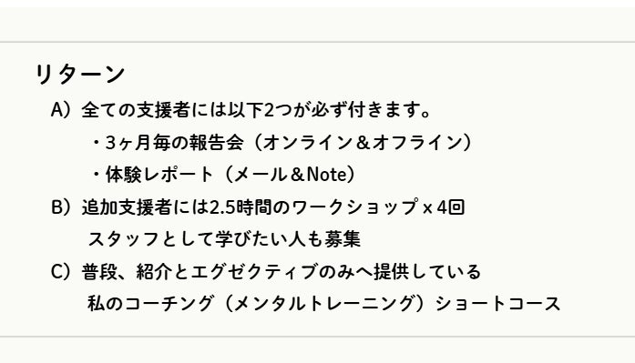 A)全ての支援者には3ヶ月毎の報告会(オンライン&オフライン)と体験レポート(Note)をお届けします。レポートのサンプルとして、こちらを御覧ください。