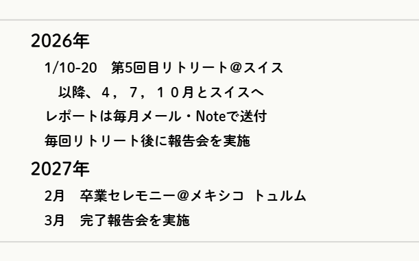 これから4回をスイスで、最後の一回は聖地メキシコのTulumへ行って卒業リトリートを行う予定。