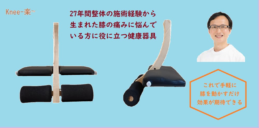 日本のある整形外科医が提唱された膝の痛みを改善できる体操からヒントを得て、私が東洋医学大学で学んだ知識と27年間の整体経験を活かし、独自に研究開発したのが健康器具【Knee-楽™(ニーラク™)】です。この器具は、足がリラックスした状態で、膝関節を【受動的に動かす】ことに着眼した全く新しいアプローチの健康器具です。