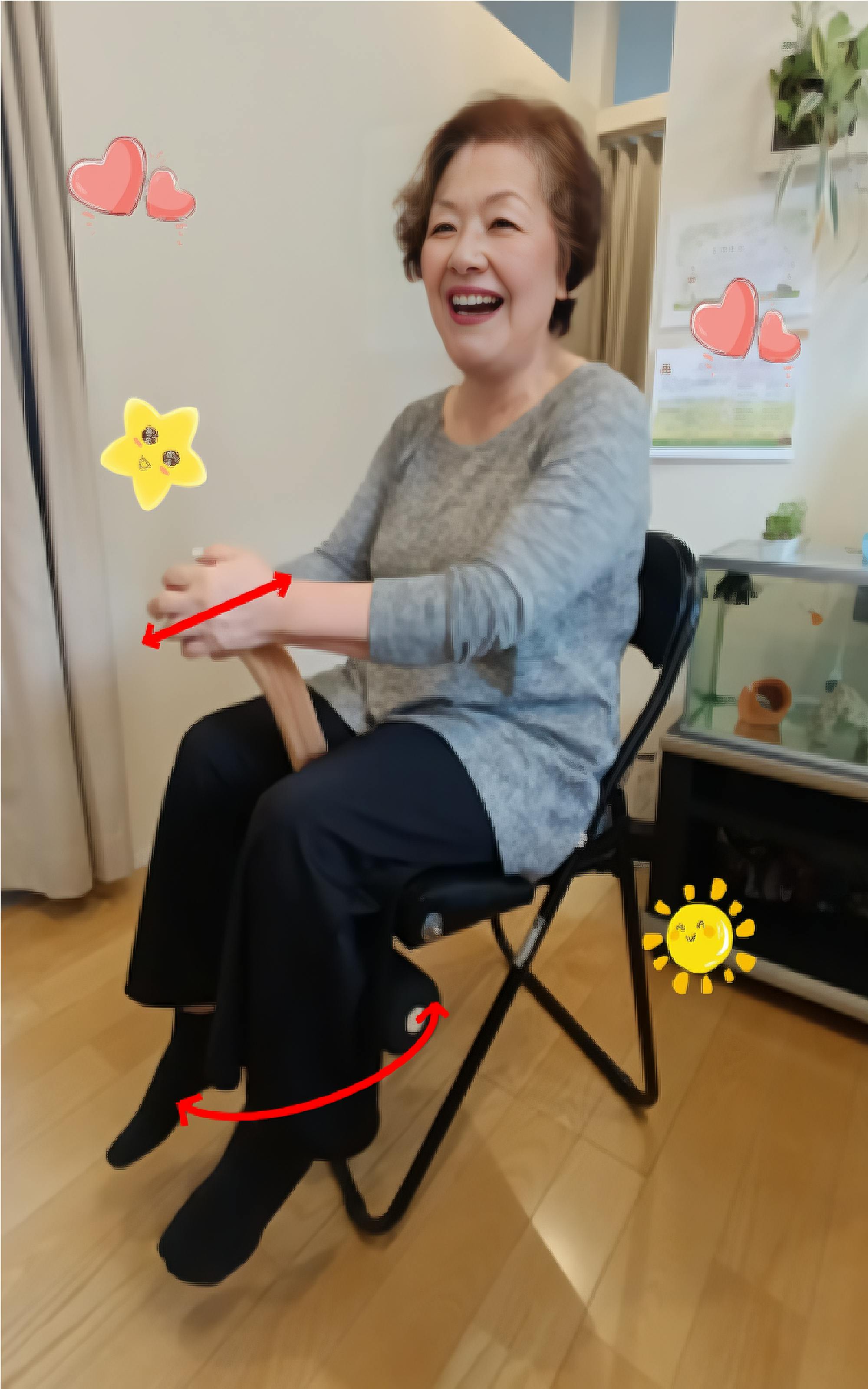 使い方はとてもシンプルです。座って手で操作棒を前後に動かし、てこの原理で簡単に下腿を前後に動かす、それで負担なく膝が動き出します。1回わずか3分間、できれば1日2回使用するだけで効果を実感していただけます。器具を使用している間は、痛みを耐えながら無理やりに膝を使うことなく、脳がリラックス状態になるため、膝関節周りの筋肉が自然に和らぎ、普段固まっていた膝関節が動きやすくなります。