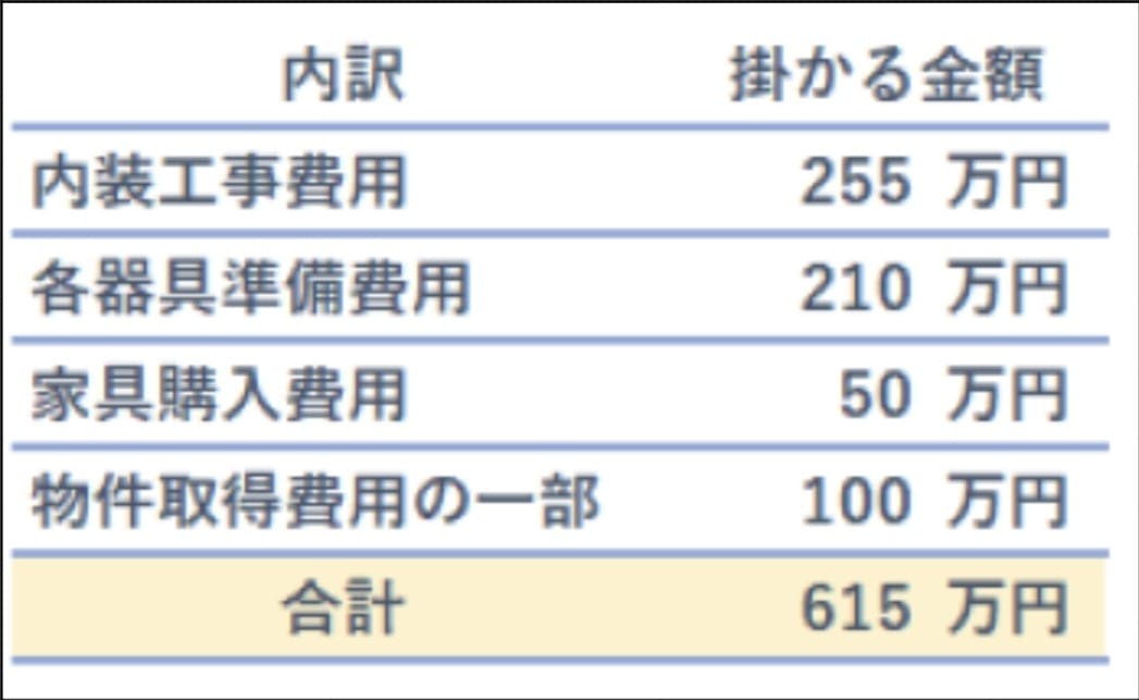 内装工事・設備導入および物件取得費用が下表のように掛かる想定です。