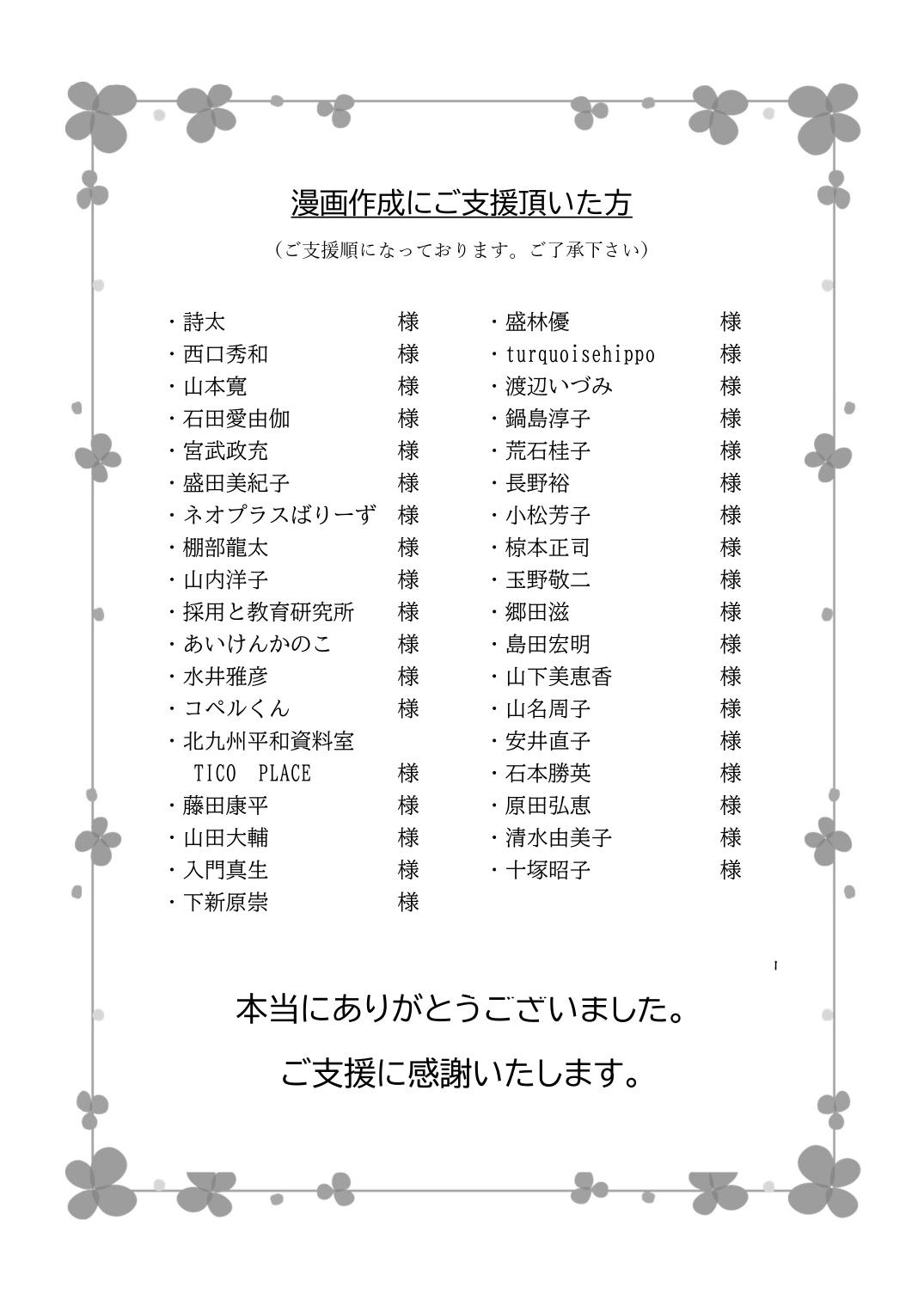 ご支援頂いた方のお名前を(備考欄にご記入頂いたお名前を掲載いたします)巻末に一覧にして掲載させて頂きます。お名前はニックネーム等でも、法人名・団体名でも構いません。(常識の範囲内でのお名前でお願いいたします)