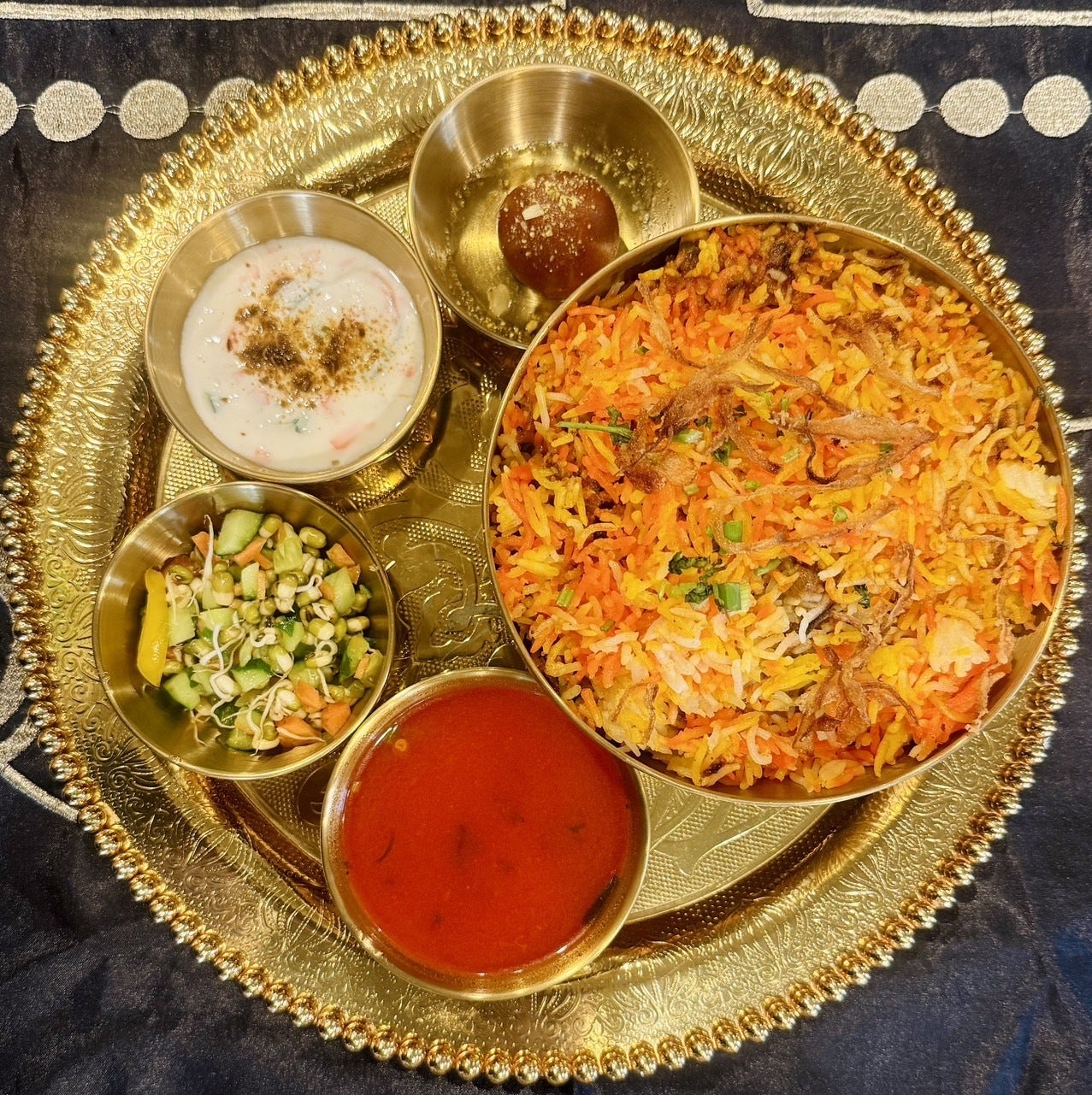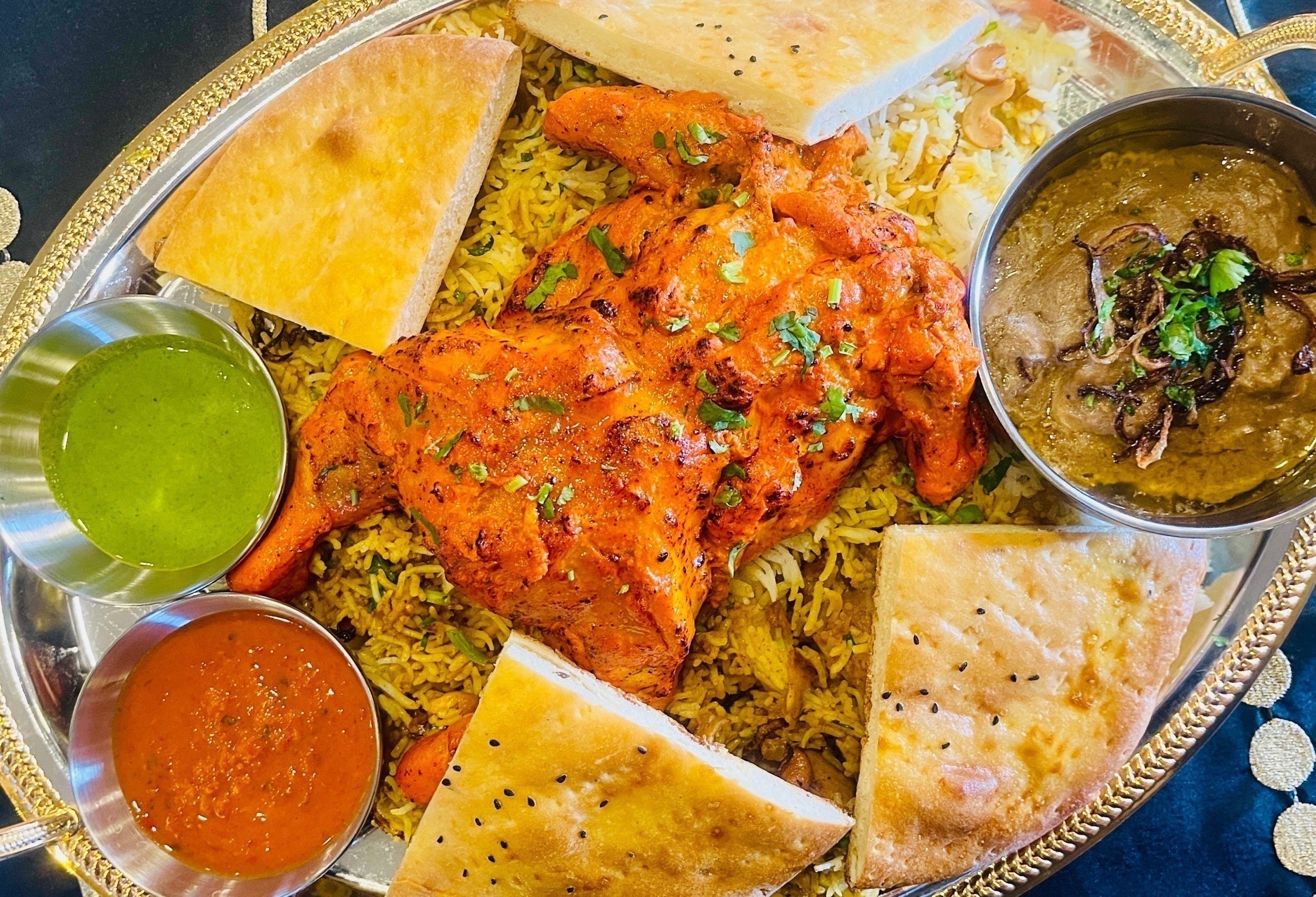 ムグライ ビリヤニは、バスマティ ライス、スパイス、ドライフルーツで作られた、マイルドで軽くスパイスの効いた、ダム調理された層状のビリヤニ