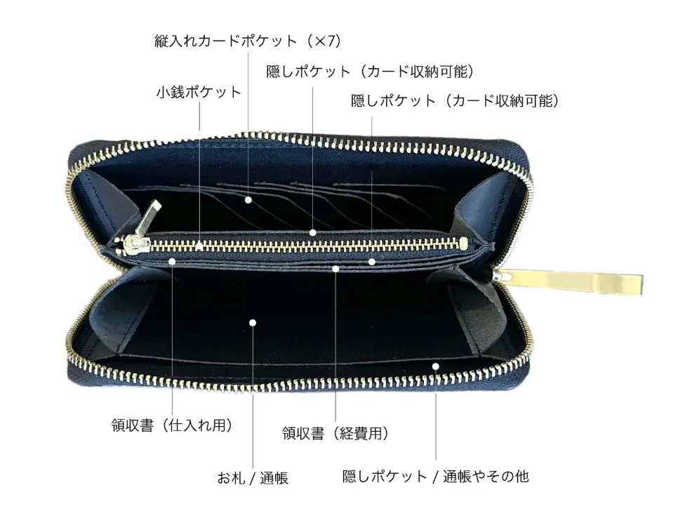 1 :札入れ1 :小銭入れ(コインポケット)2:フリーポケット1:隠しキーポケット