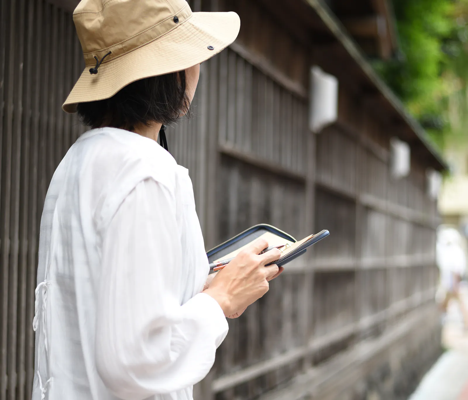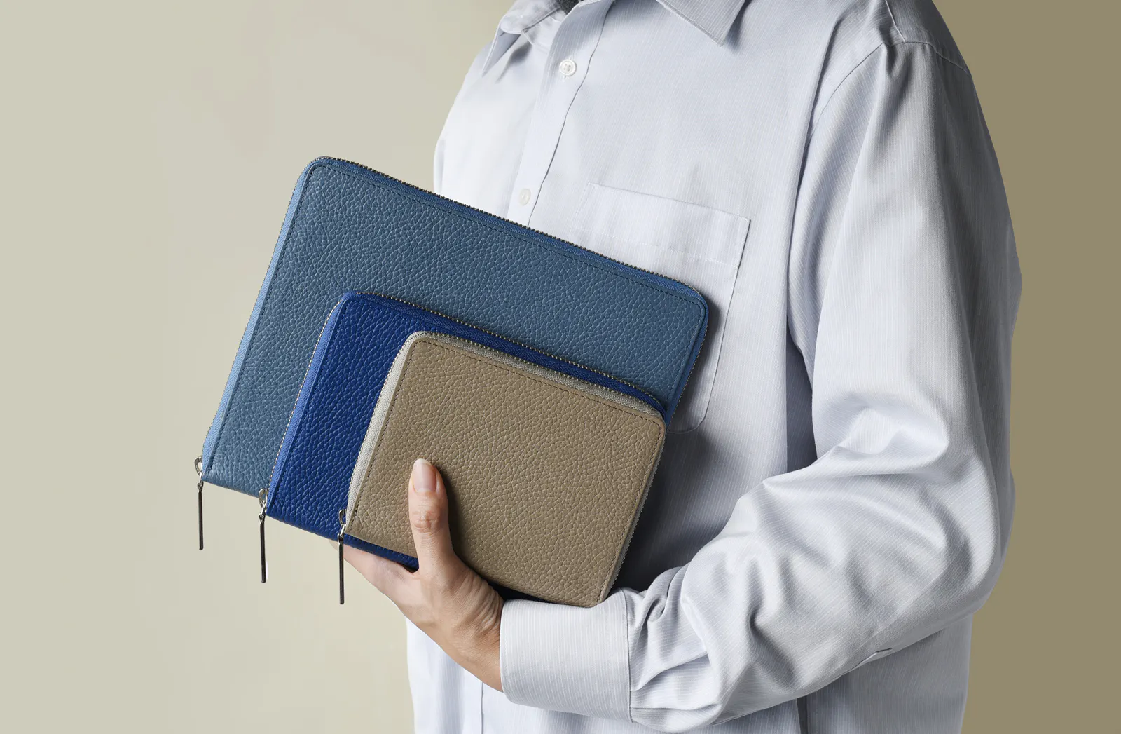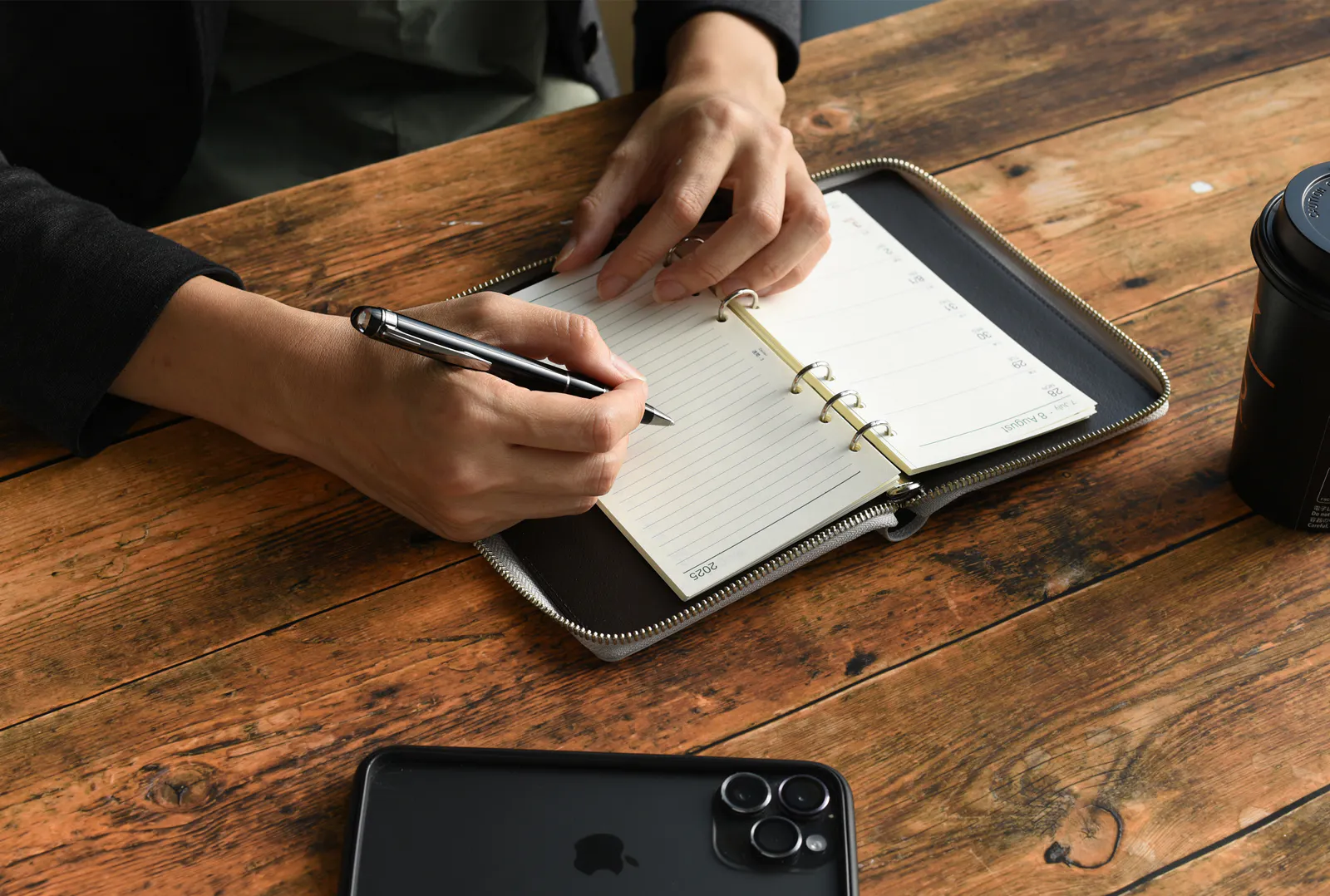 ZIP手帳は激しい動作や多忙な現場でも中身が落ちないよう、あえて外側にポケットを設けないシンプルな構造で仕上げていました。