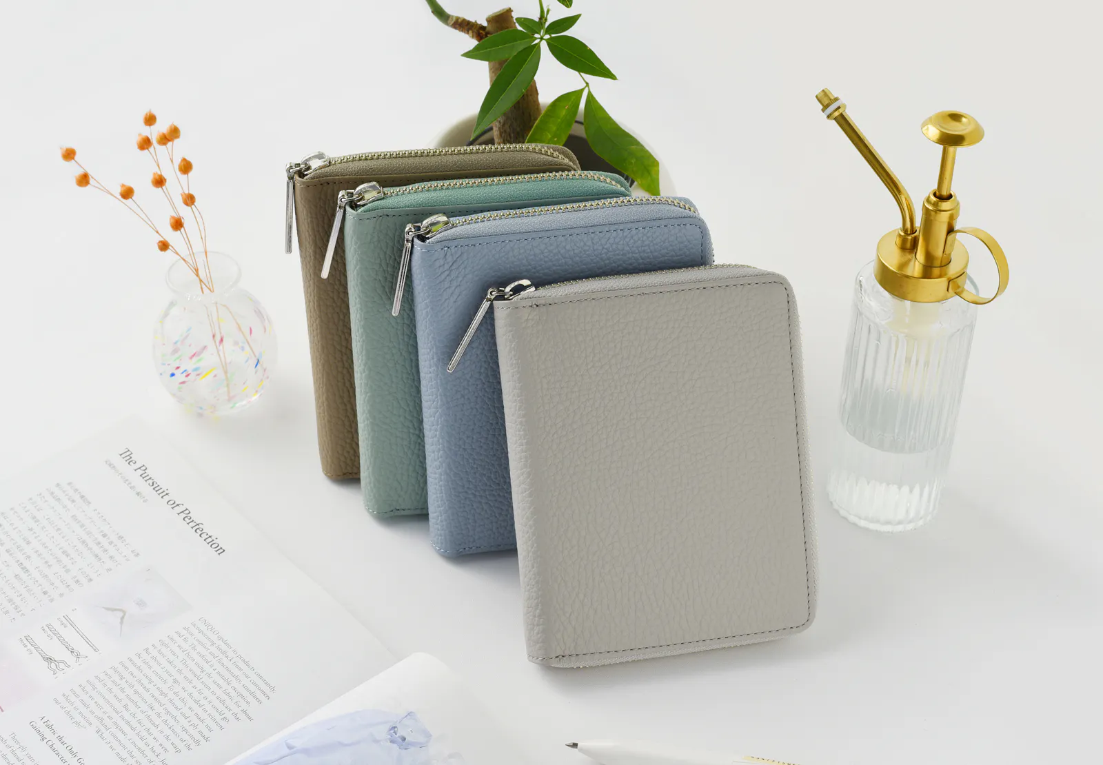 展開製品:コンパクト財布、長財布、名刺入れ、カード入れなどの革小物。