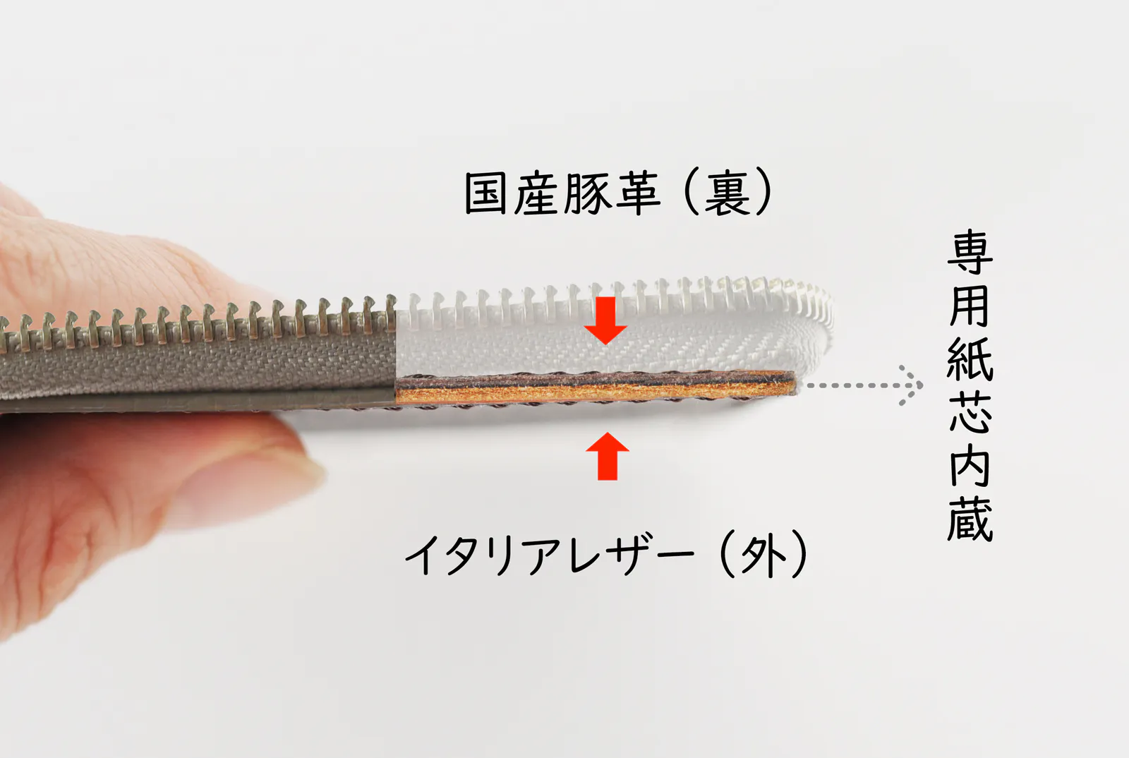 また、紙リフィルと直接接する裏面には、革靴の内装にも使われる、軽くて色移りしにくい国産豚革を使用しています。