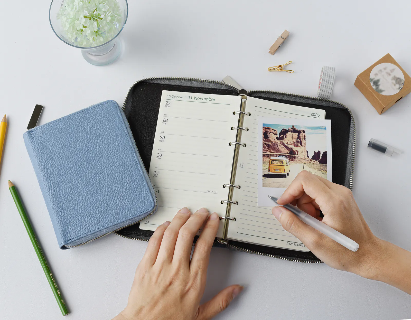 軽量で携帯しやすい小型システム手帳です。コンパクトなバッグにも収まるため、旅行先で荷物にならない便利なサイズです。