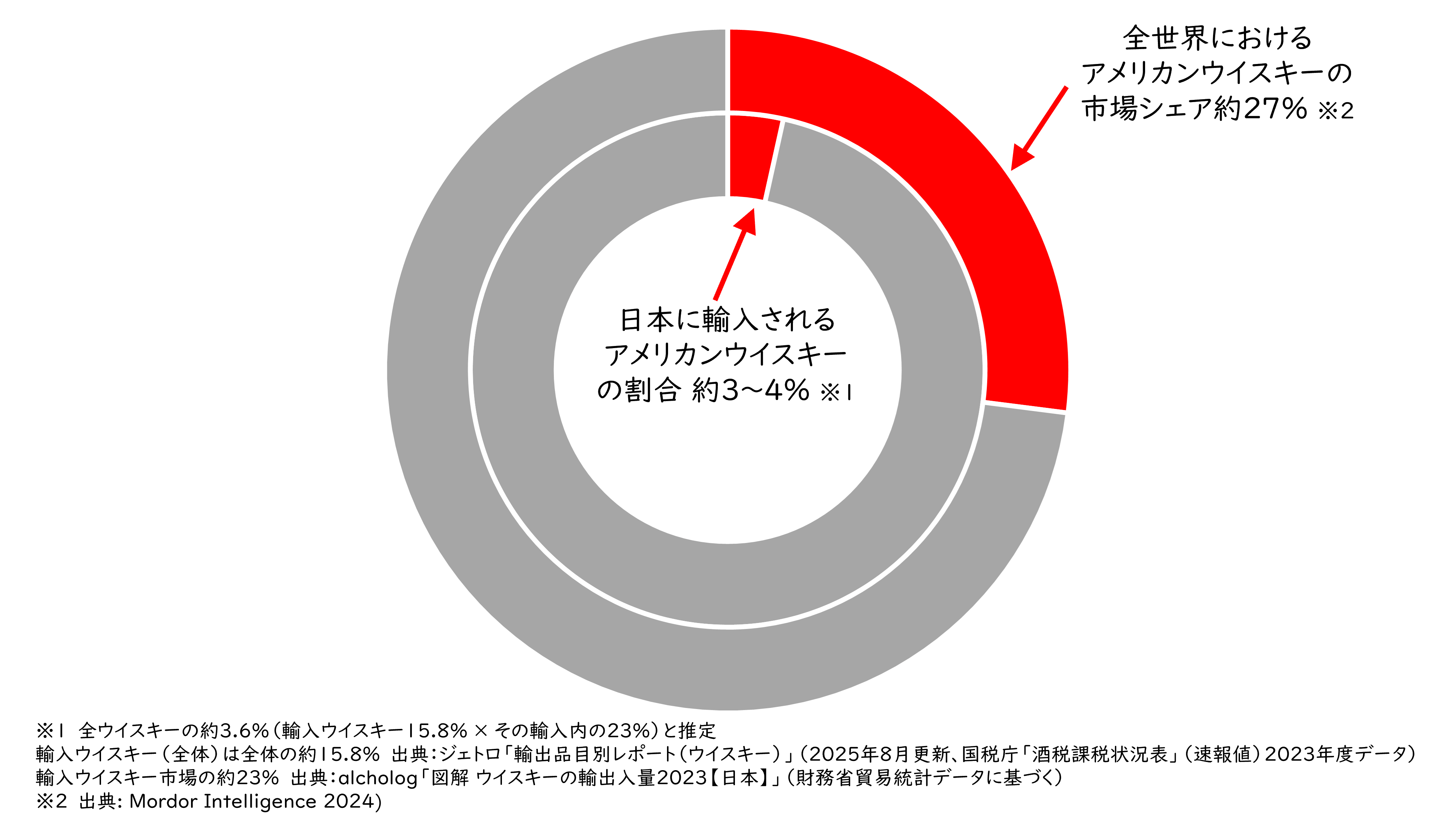 日本で輸入されるアメリカンウイスキーは、全ウイスキーの約3.6%一方で、全世界におけるアメリカンウイスキーの市場シェアは約27%という統計データもあることから、日本と世界でバーボンウイスキーの消費に大きな開きが確認でき、全世界と比較して日本ではバーボンウイスキーがまだまだ注目されていないと言えます。