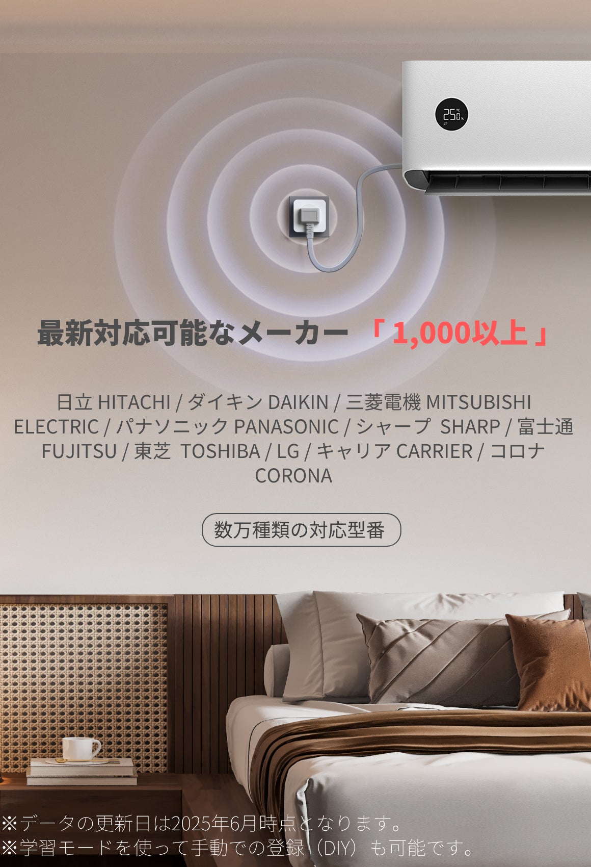 2.対応するエアコンのリモコン機種を大幅に拡張しました。 以前は約800ブランド対応でしたが、今回は1,000ブランド以上に対応。 さらにカスタマイズ機能を強化し、日本国内の主要エアコンブランドのカバー率は95%以上となっています。