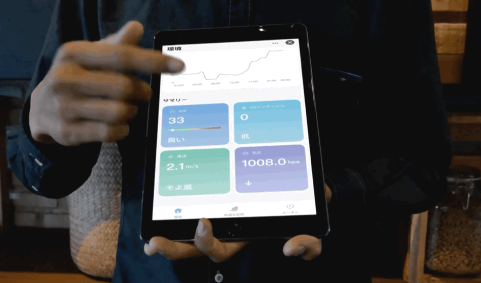 アプリでは、外気温や室温・湿度の変化をリアルタイムで取得。