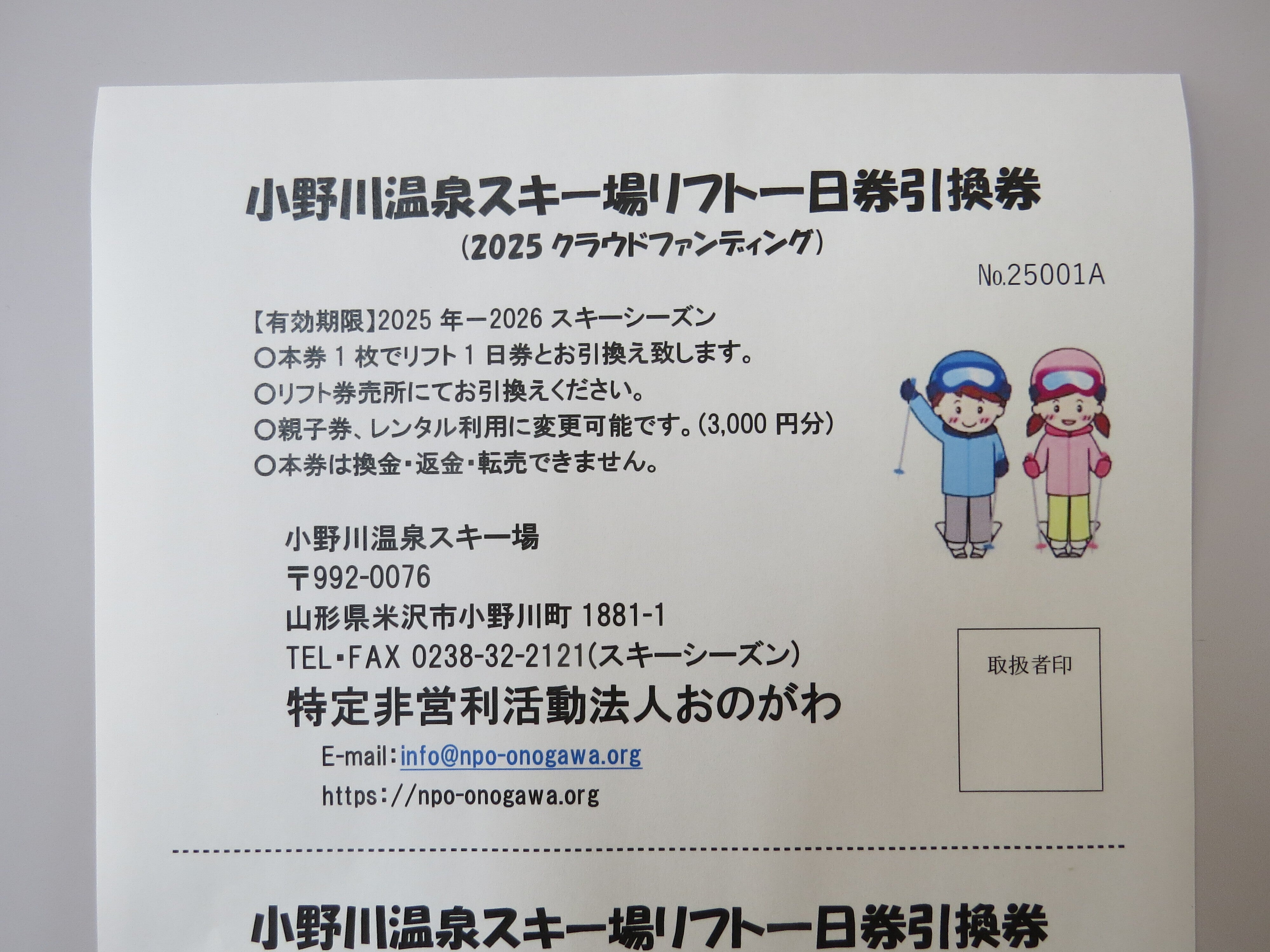 有効期限 2026スキーシーズン 原則火曜日~金曜日のスキー授業等の予約が入っていない日に限ります。ホームページのシーズンカレンダーを参考にご覧ください。