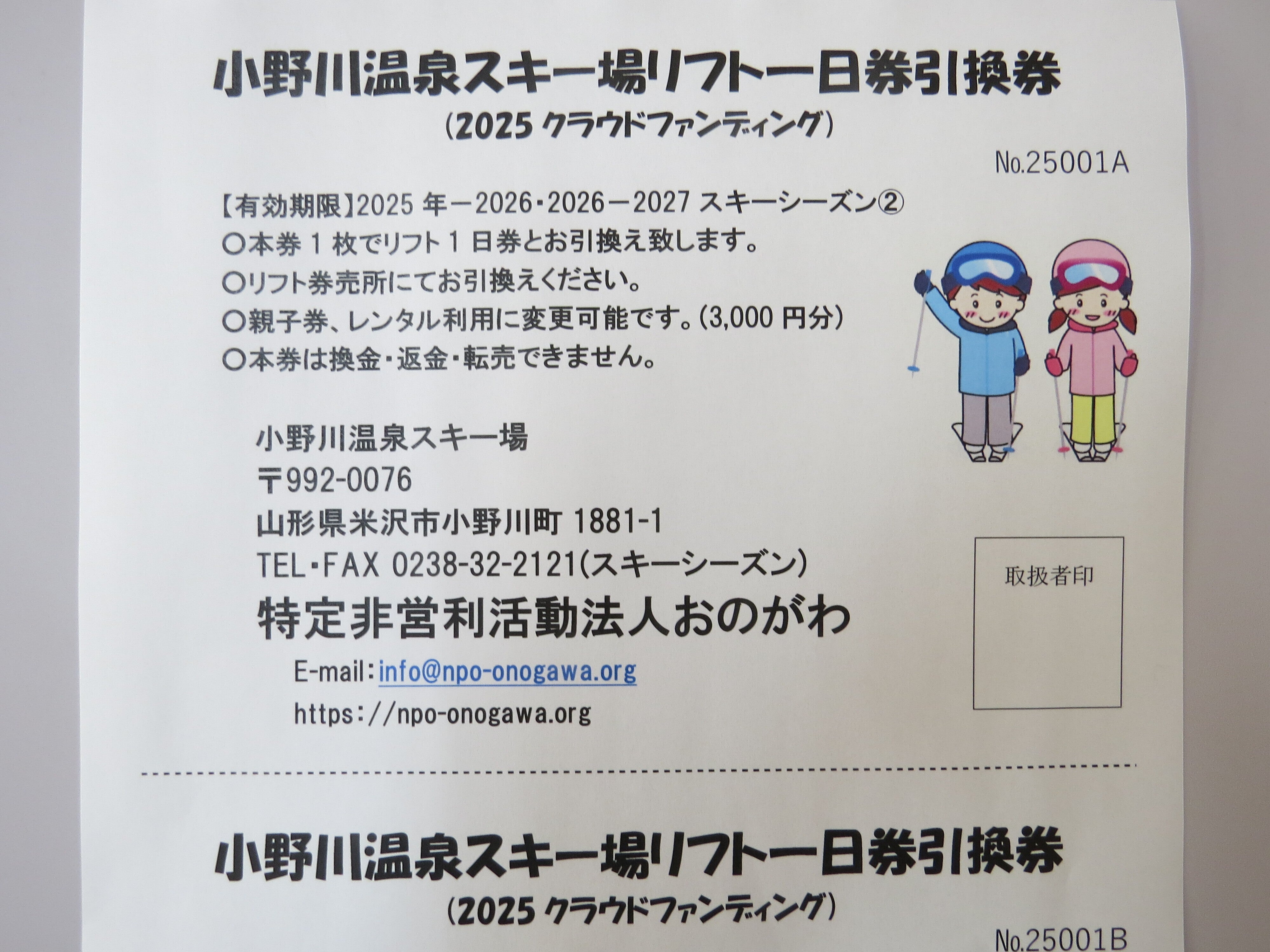 ・小野川温泉共通利用券(1,000円分 利用期限R8.5)※1 + 一日券引換券1枚(利用期限2026シーズン)※2