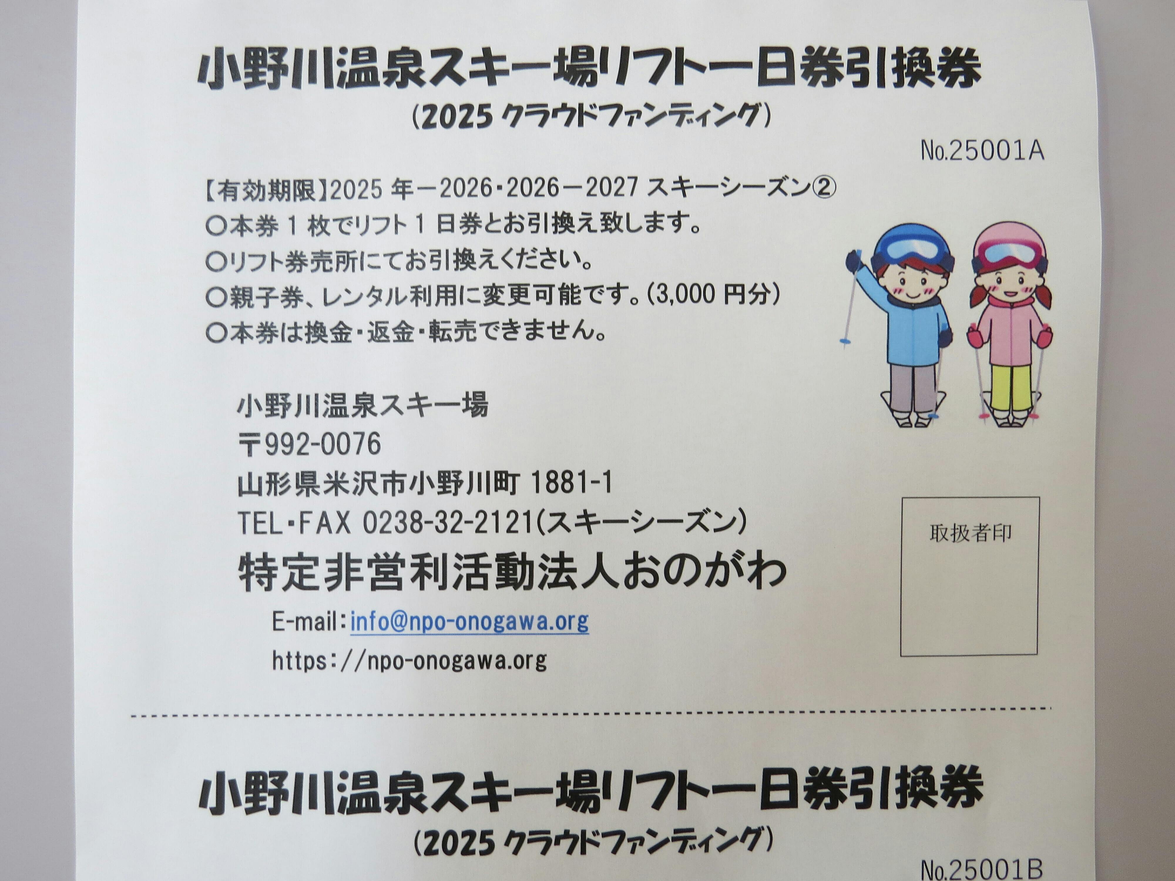・小野川温泉共通利用券(1,000円分 利用期限R8.5)※1 + 一日券引換券1枚(利用期限2026シーズン)※2