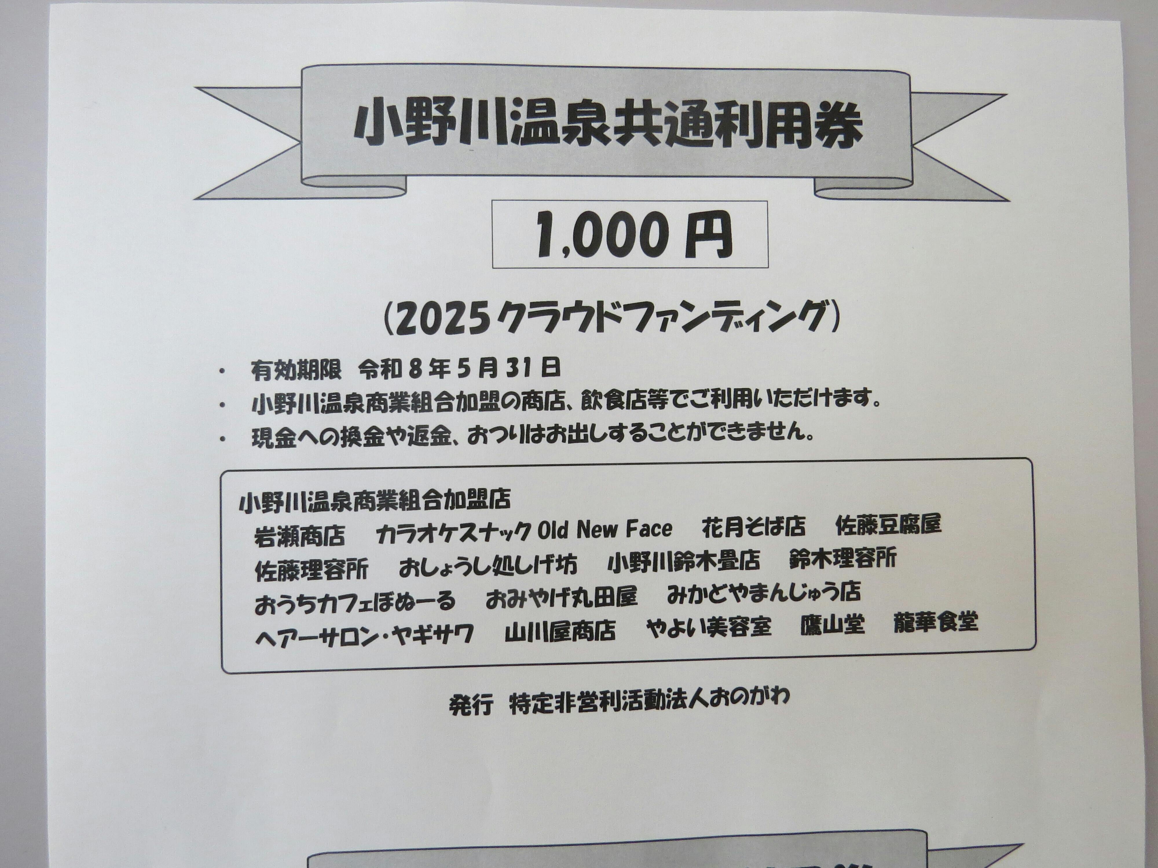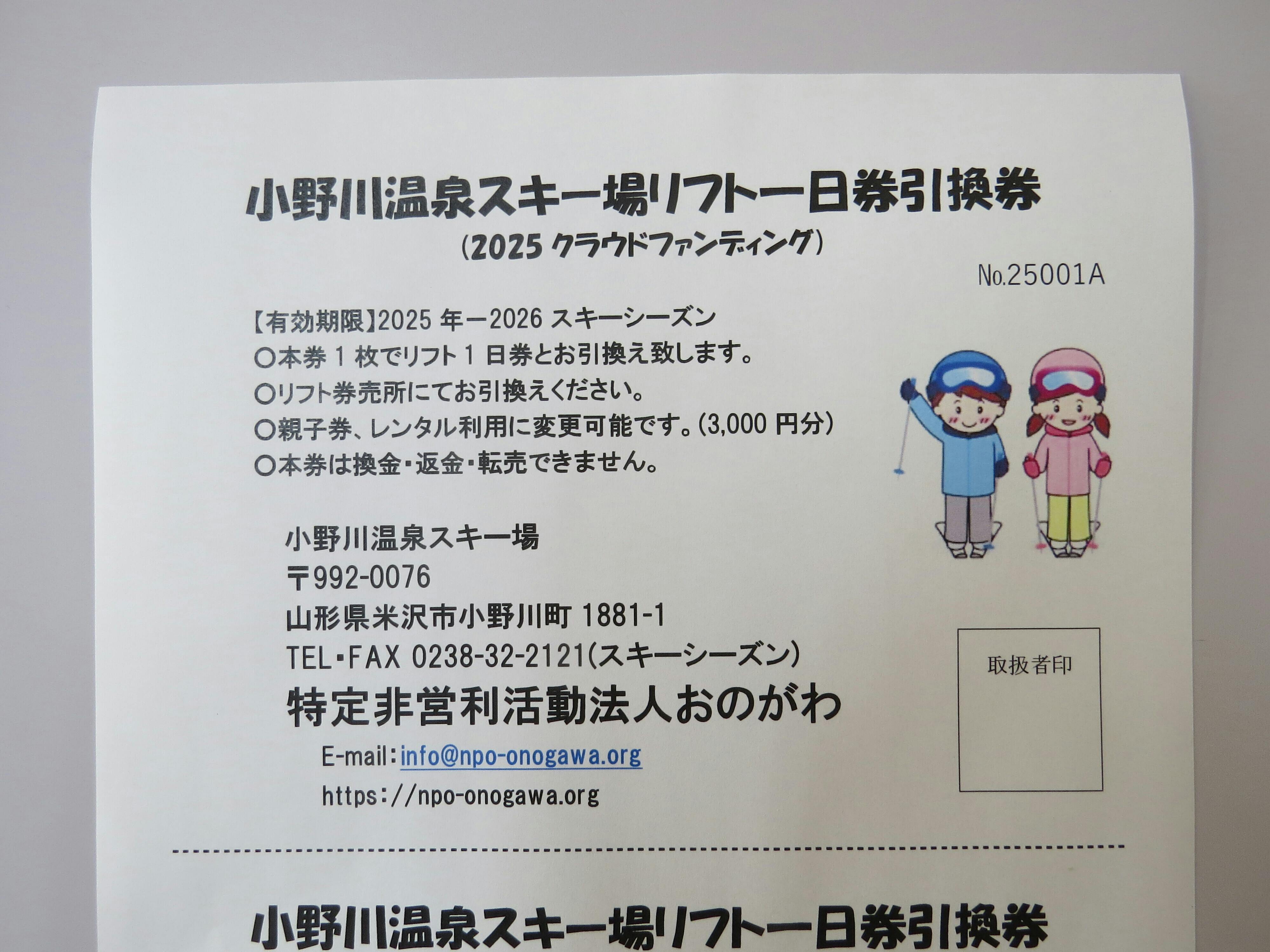 ・小野川温泉共通利用券(1,000円分 利用期限R8.5)※1 + 一日券引換券1枚(利用期限2026シーズン)※2