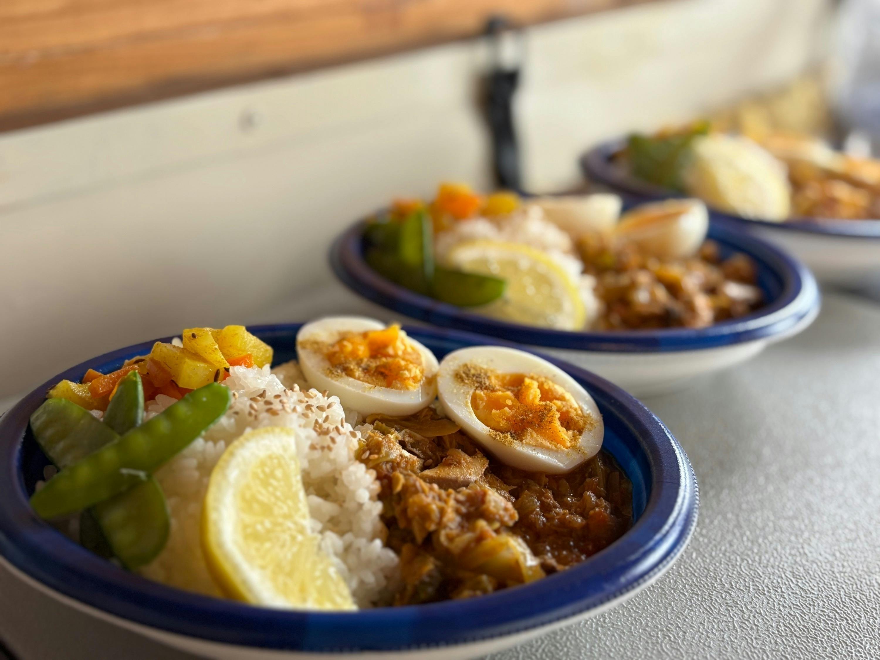 日替わりのカレーメニューは季節の野菜やお肉、お魚など、今まで作ってきた種類は数えきれません。スパイスやハーブを使ったこだわりの副菜も気まぐれ。毎週…いや、毎日でも飽きずに食べられるカレーです!