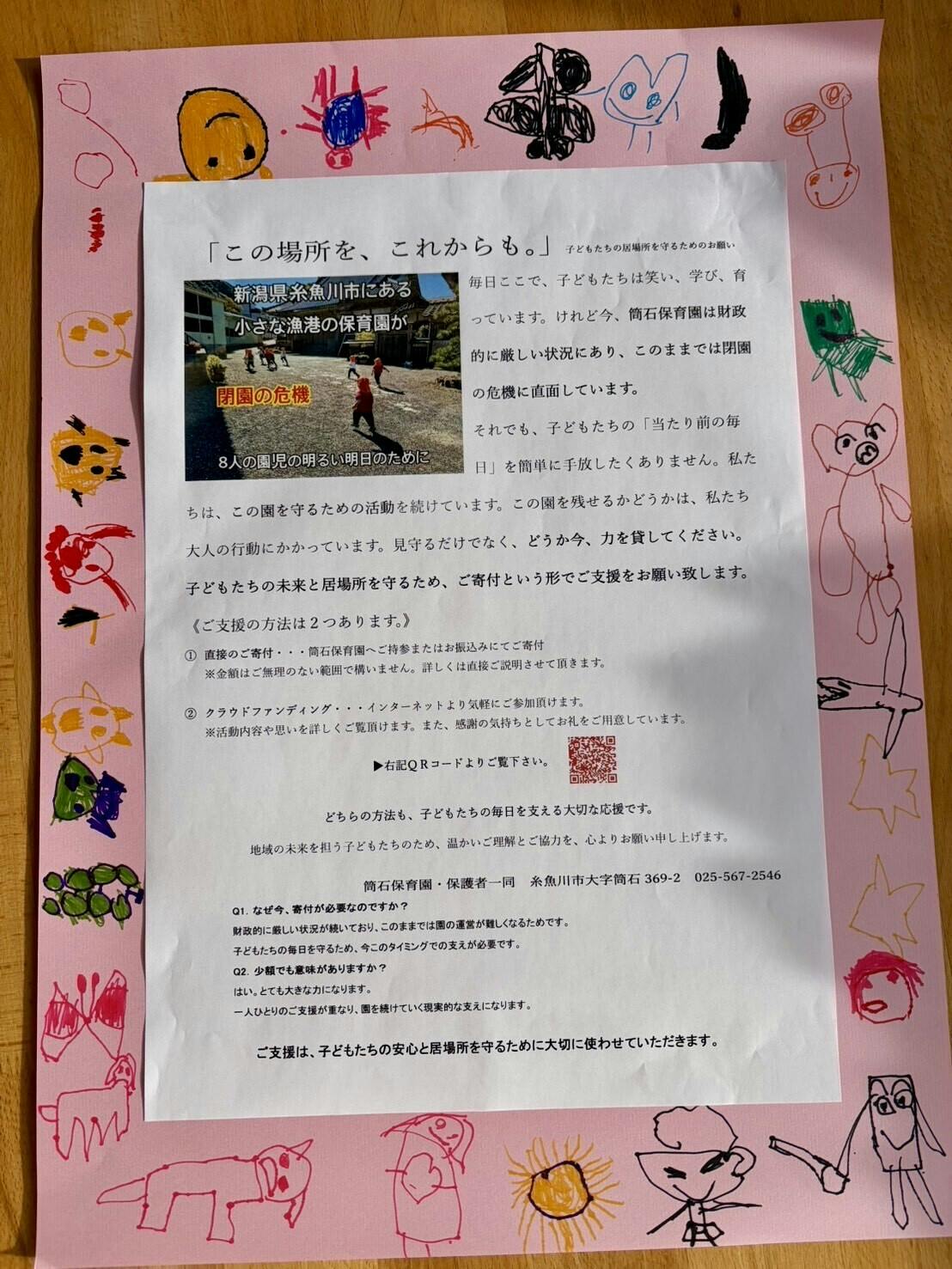 子どもたちの手描きイラストに囲まれたポスター。小さな保育園の大きな願いが、地域の皆さまに届きますように。