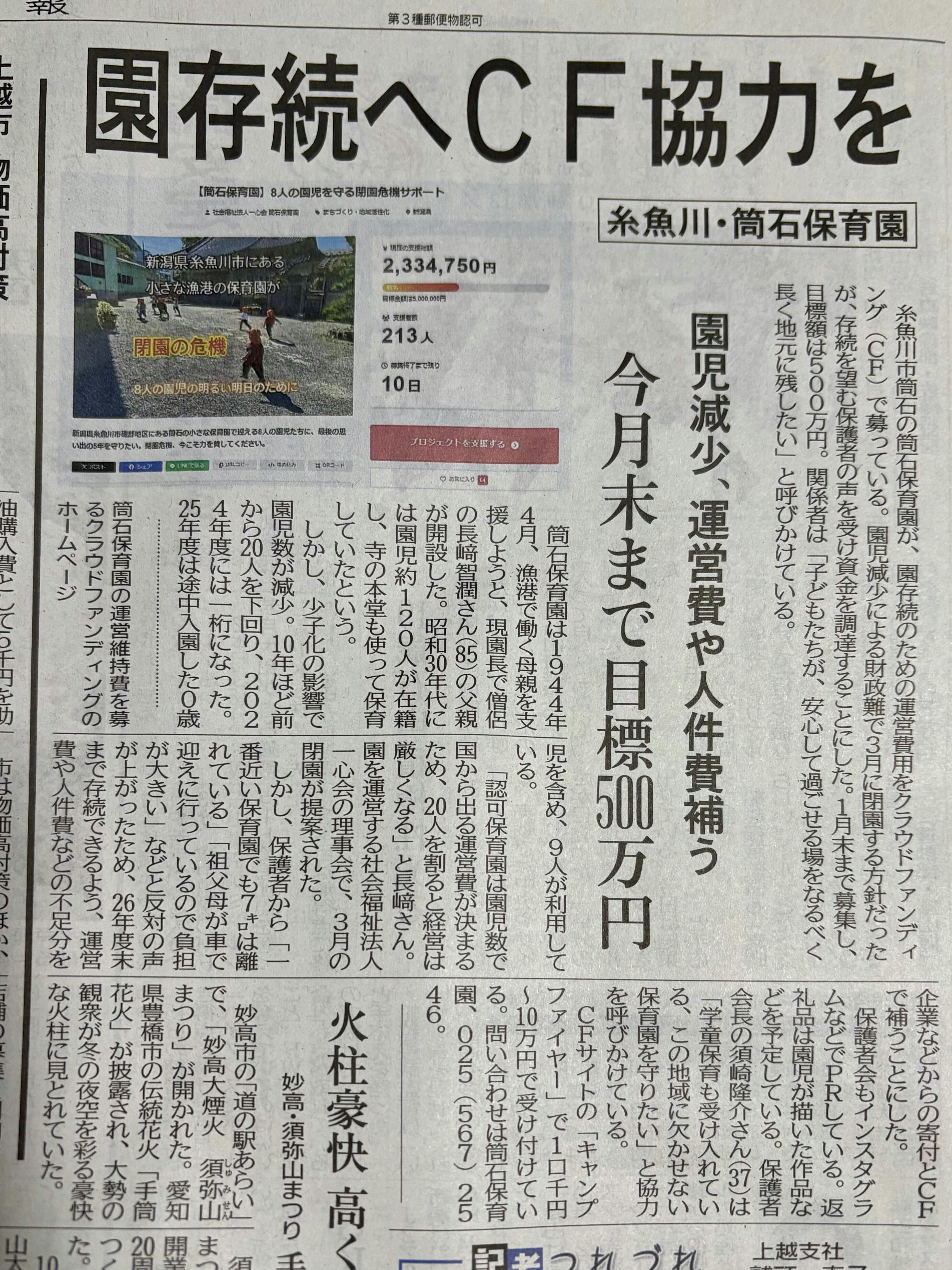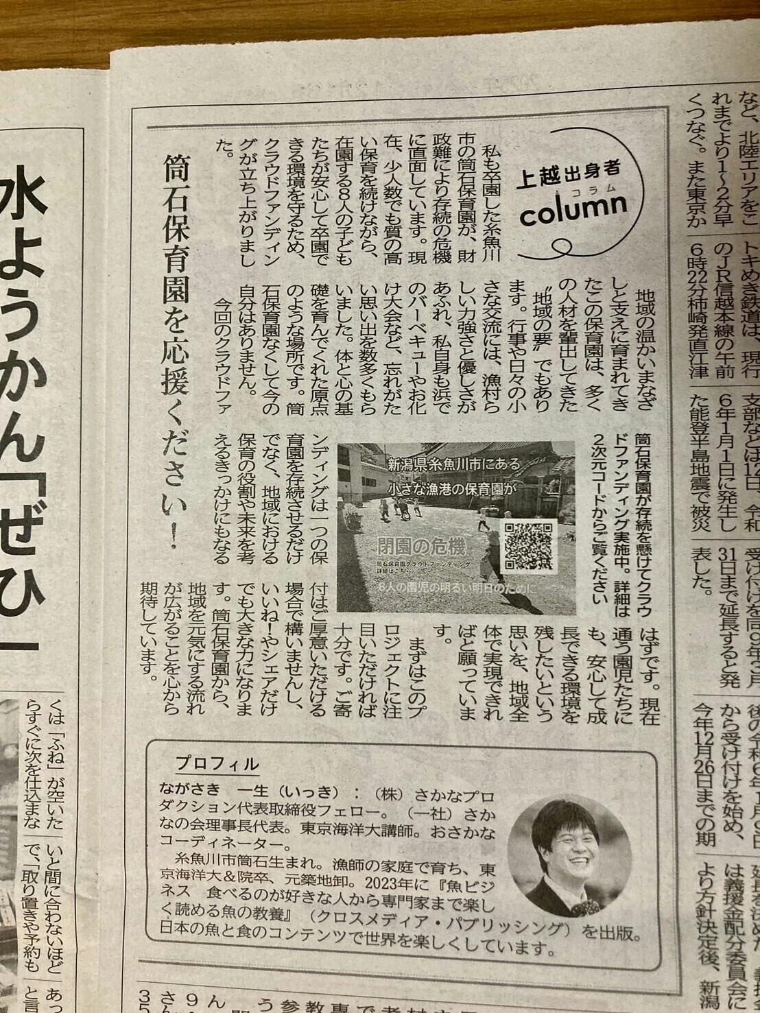 支援者の方のお力添えで、株式会社上越タイムス社様のコラムに取り上げていただきました。