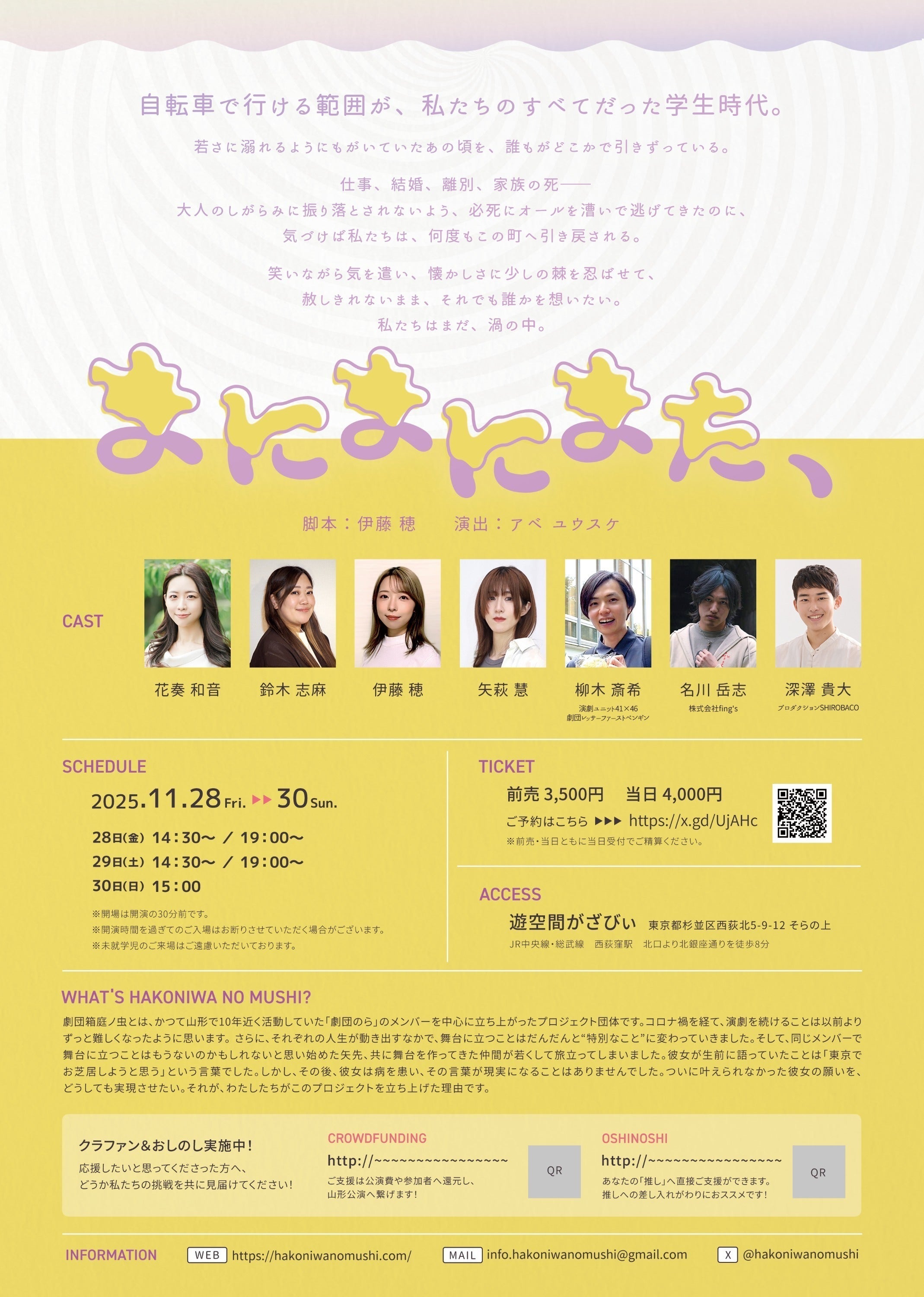2025年11月に東京・西荻窪の「遊空間がざびぃ」で上演する公演『まにまにまた、』の公演費を募ります。