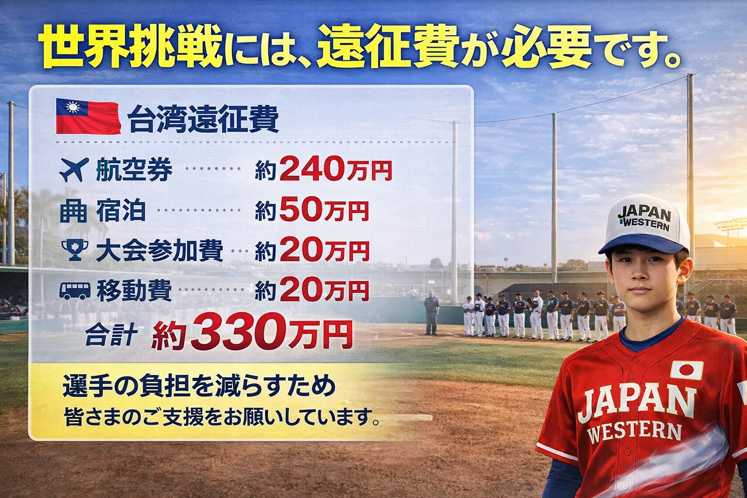 2026/03/10 11:32今、日本の中学生野球の多くは地域の大会の中で完結しています。しかし世界では違います。アメリカ台湾ヨーロッパ、若い世代の選手たちはすでに国境を越えて試合をしています。私は長年、中学生野球の指導に携わりながらずっと思ってきました。日本の子どもたちにも世界を見せたい。世界を見て世界と戦い世界の空気を吸う。それは単なる野球の経験ではありません。人生を変える経験です。西日本から、世界へ。今回、私たちは西日本選抜というチームを結成し世界大会に挑戦します。福岡を中心に「九州・中国・四国」の選手が集まり西日本代表として世界に挑むプロジェクトです。 なぜこの挑戦が必要なのか。私はこれまで「ヨーロッパ遠征・台湾遠征・国際大会」などを通じて世界の野球を見てきました。そして確信しています。世界を知った子どもは人生の見方が変わります。世界は広い自分の可能性も広い。そう気づくからです。 この挑戦は未来への投資です。今回の遠征は単なる大会参加ではありません。これは西日本選抜プロジェクトの第一歩です。将来は「西日本選抜・九州選抜・日本選抜」という形で日本の中学生が世界へ挑戦する仕組みを作ります。 【ご支援のお願い】 子どもたちが世界に挑戦するためには遠征費大会費渡航費多くの費用が必要です。今回のクラウドファンディングは未来の挑戦への投資です。どうか日本の子どもたちが世界へ羽ばたくための一歩を応援していただければ幸いです。 もっと見る