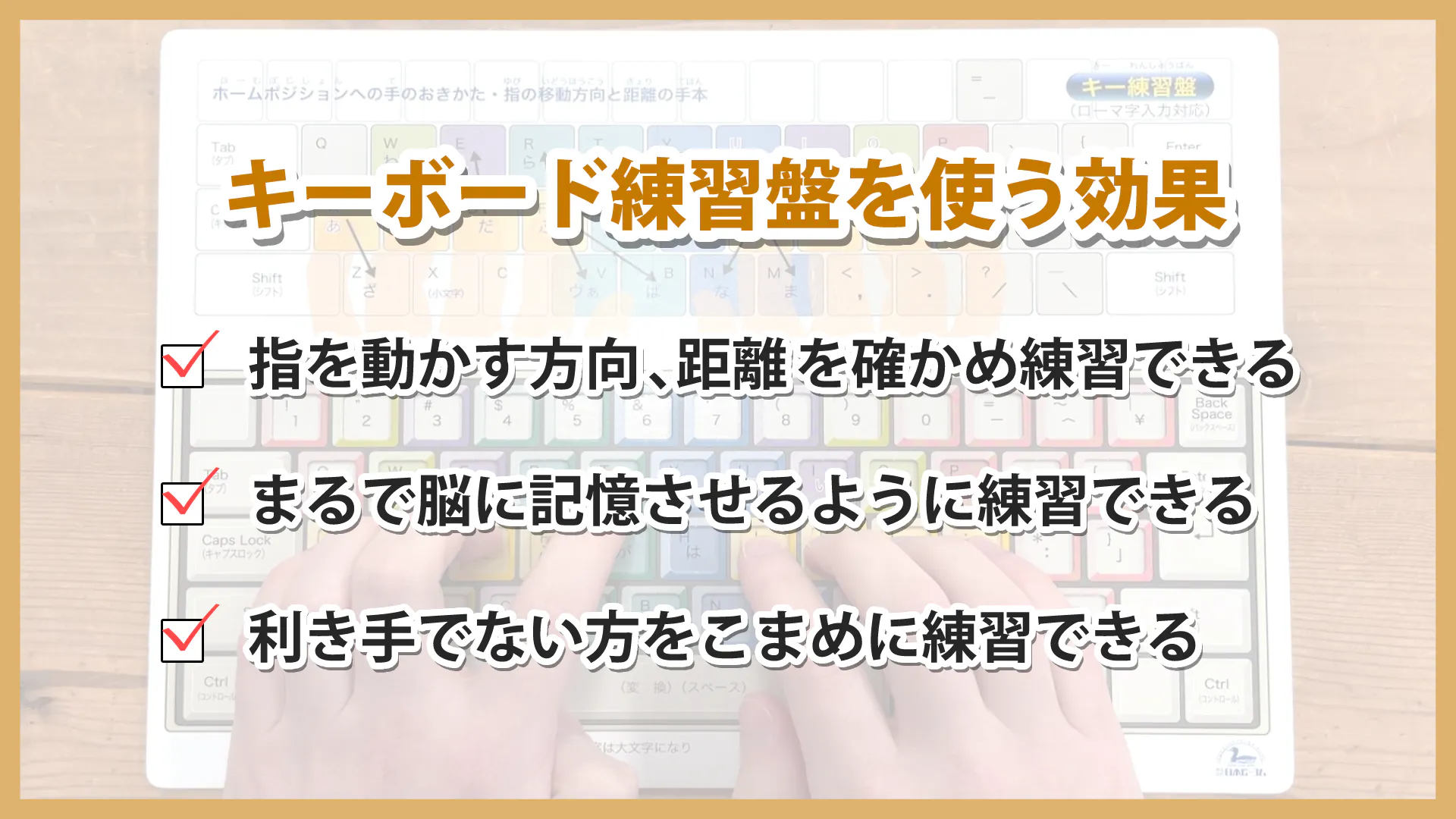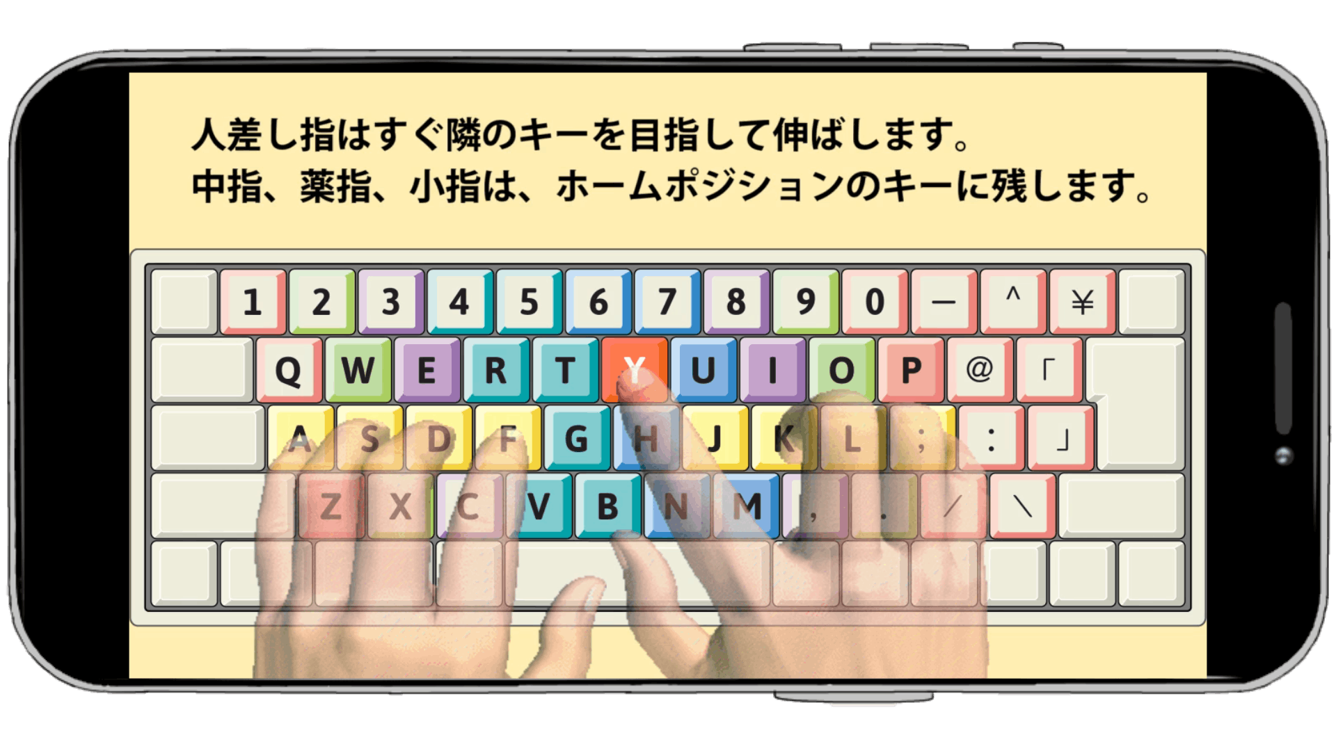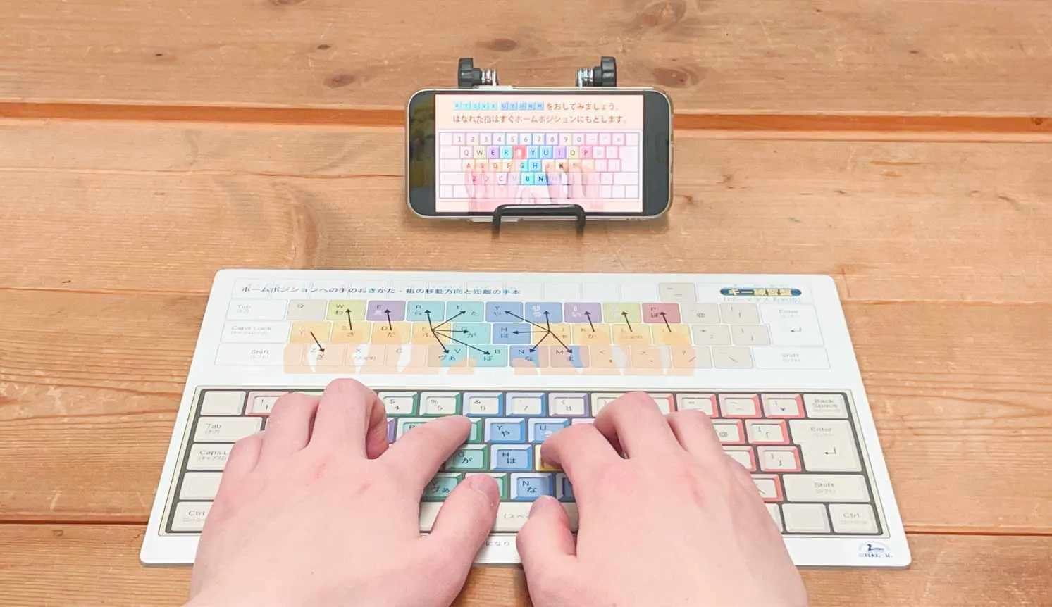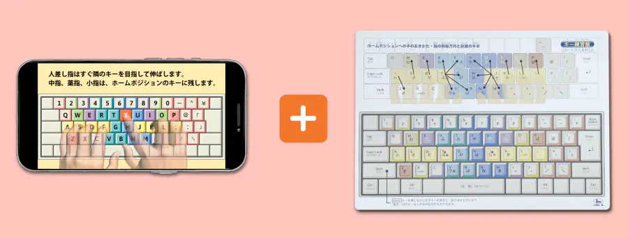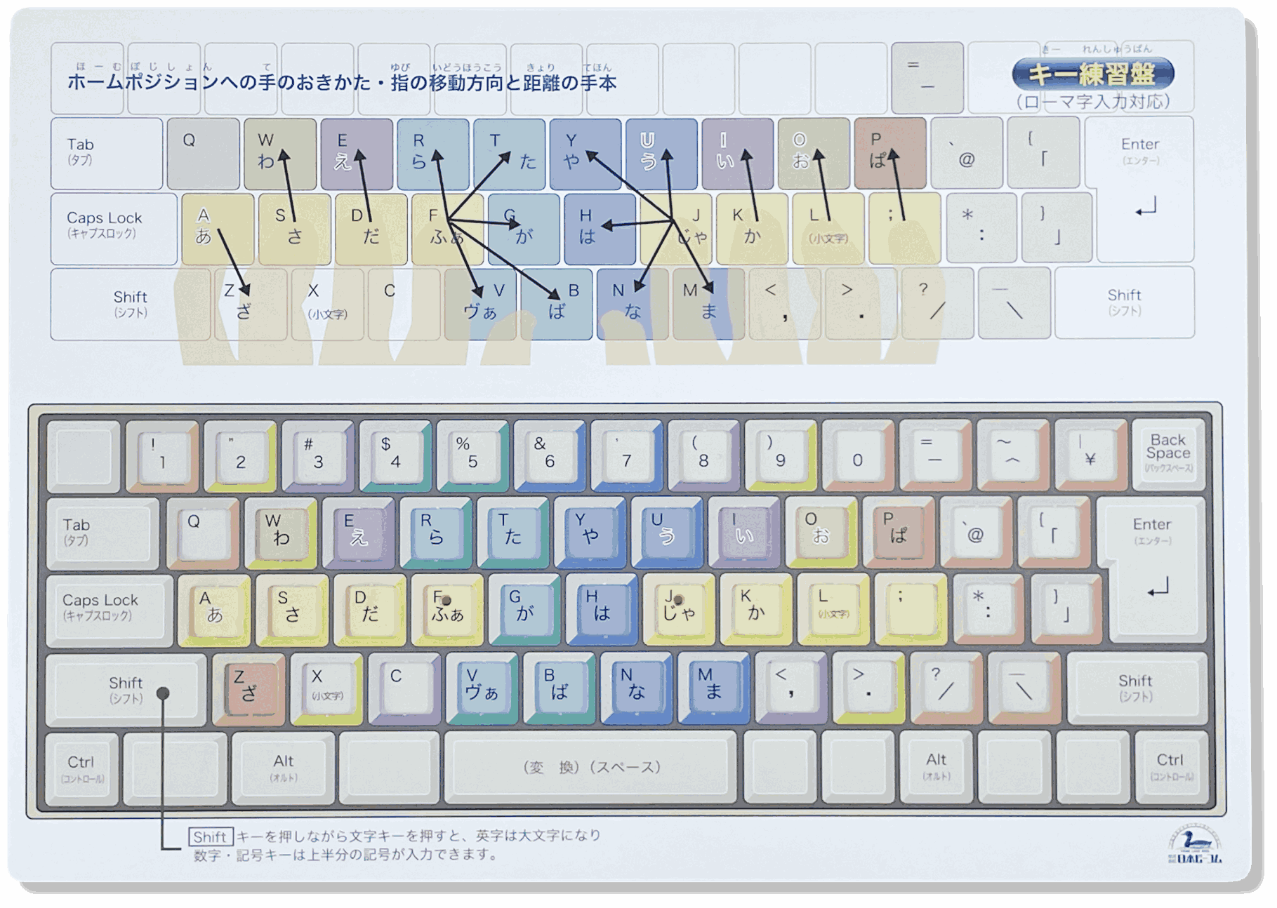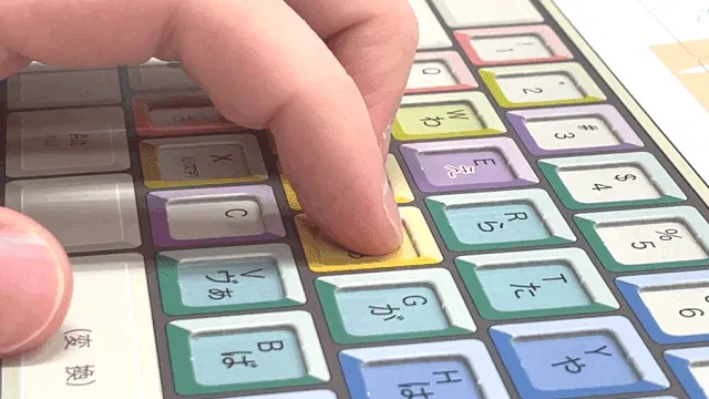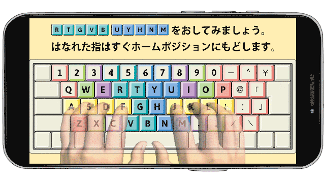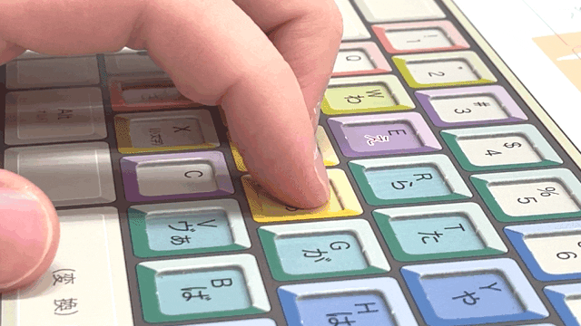 指の分担の色分け、指を動かす方向と距離がひと目でわかります。小学生から就職前の学生さん、楽に入力したい社会人までに、役立つツールです。