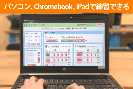 DXタイピングは、Windowsパソコン、Chromebook、iPadで利用できます。Mac、スマートフォンには対応していません。