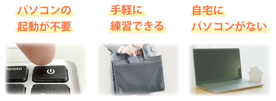 パソコンの起動が不要…手軽に練習したい方、パソコンが職場で自宅にはない方、スマホはもっていてパソコンの購入を迷っている方にもおススメです。