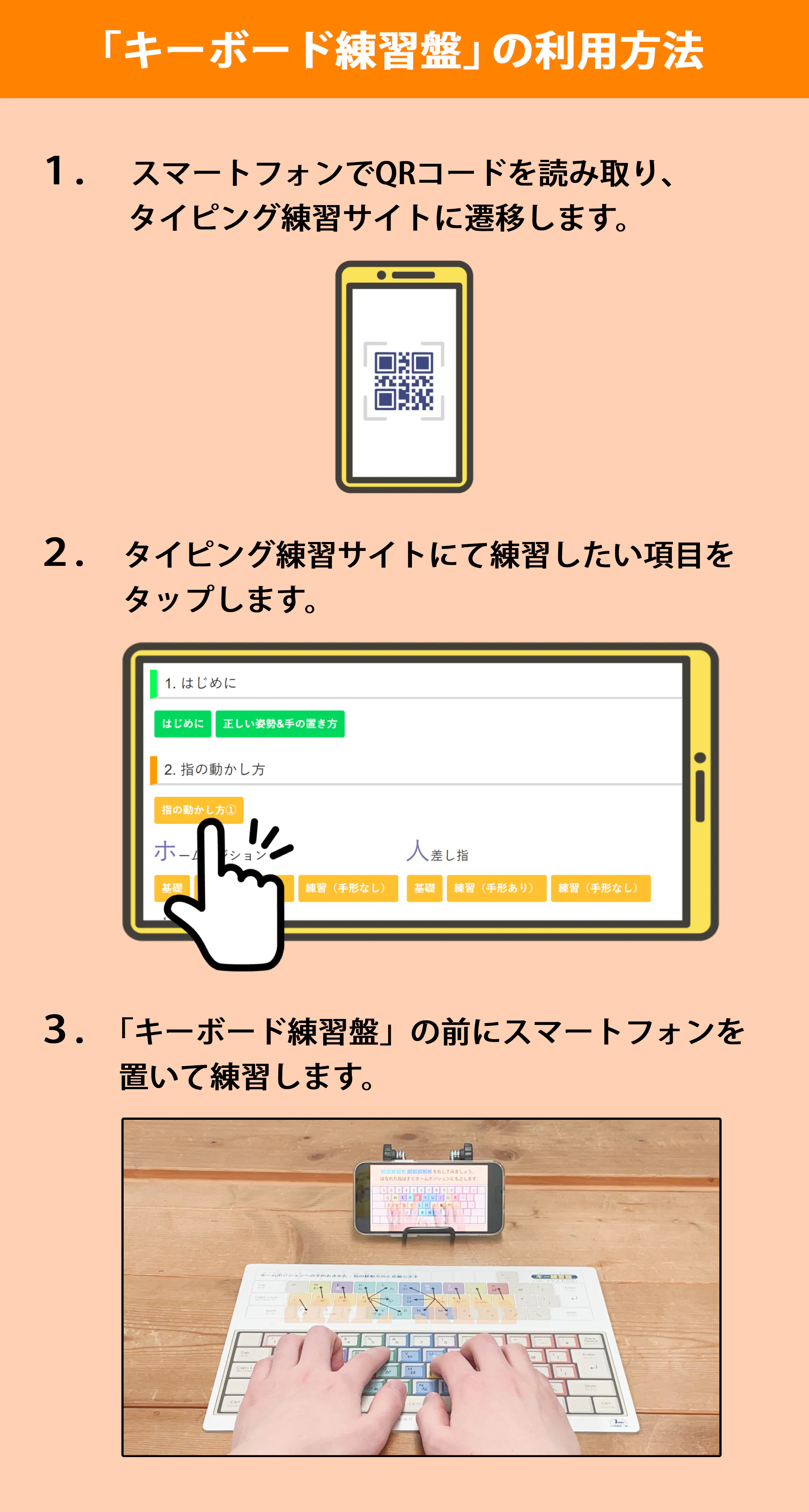 QRコードを読み取るとタイピング練習動画が見れます。画面に表示される手本(正しい指の動かし方)を見ながら練習すると、正しい文字入力を覚えられます。