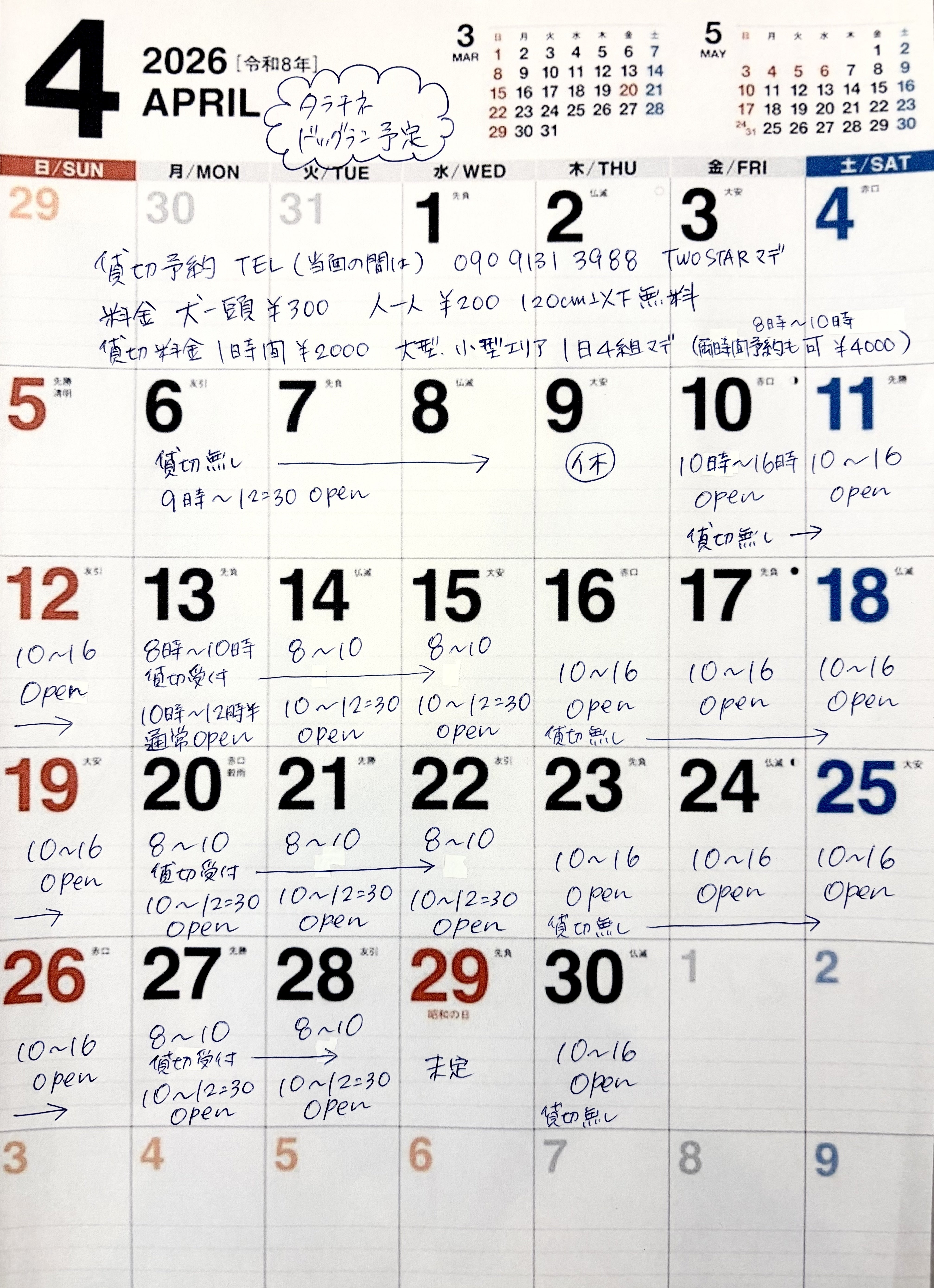 スケジュールは画像の通りです。まだバラバラスケジュールで覚えづらいと思います。ごめんなさい!平日は私が午前に開けて午後は TWO STARに戻りますので営業時間が短くなります。