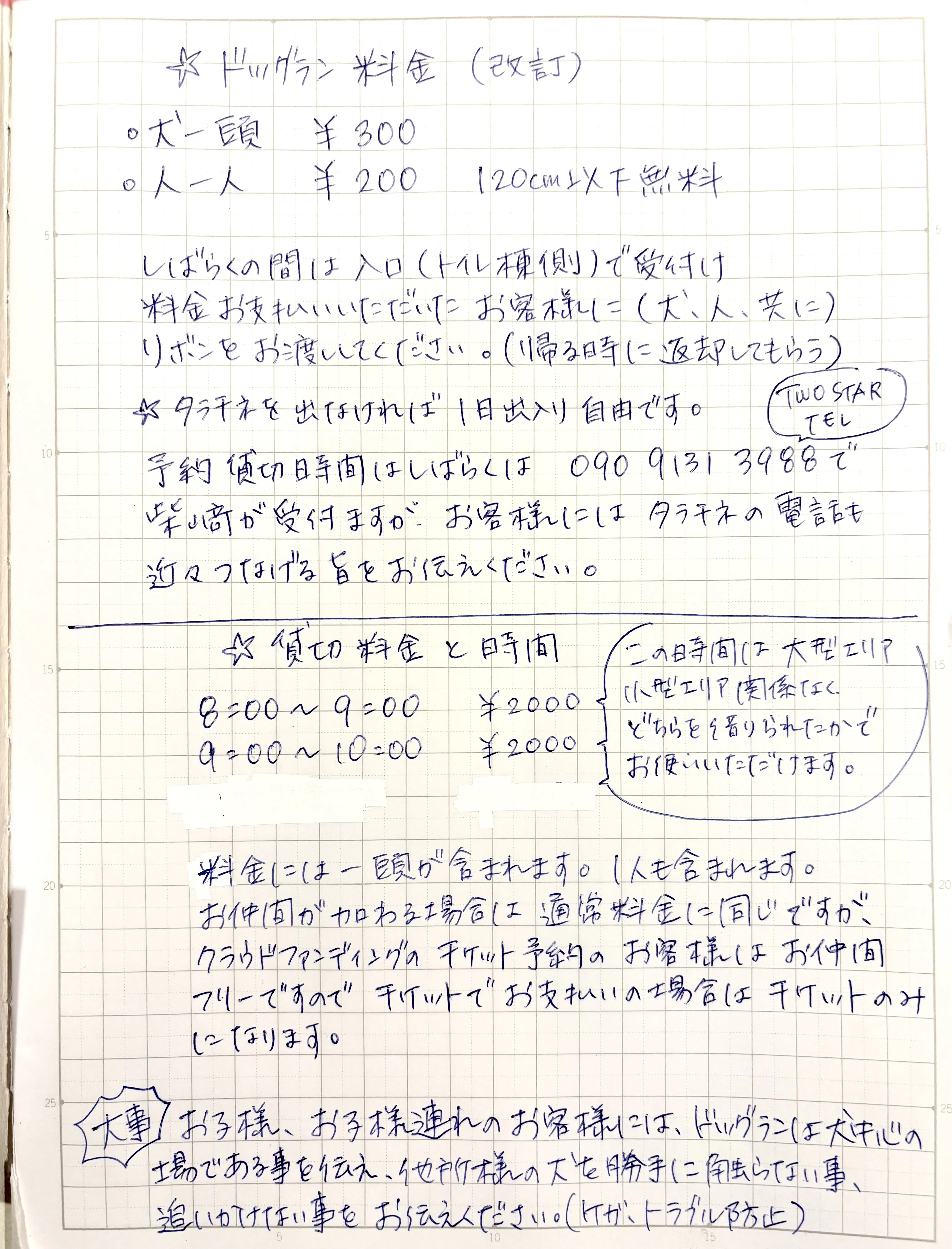 あと、電話番号が TWO STARのものであることと、対応が私1人ですので出られない時もあると思います。予約サイトの導入なども検討していますがとりあえずこれでスタートさせます。