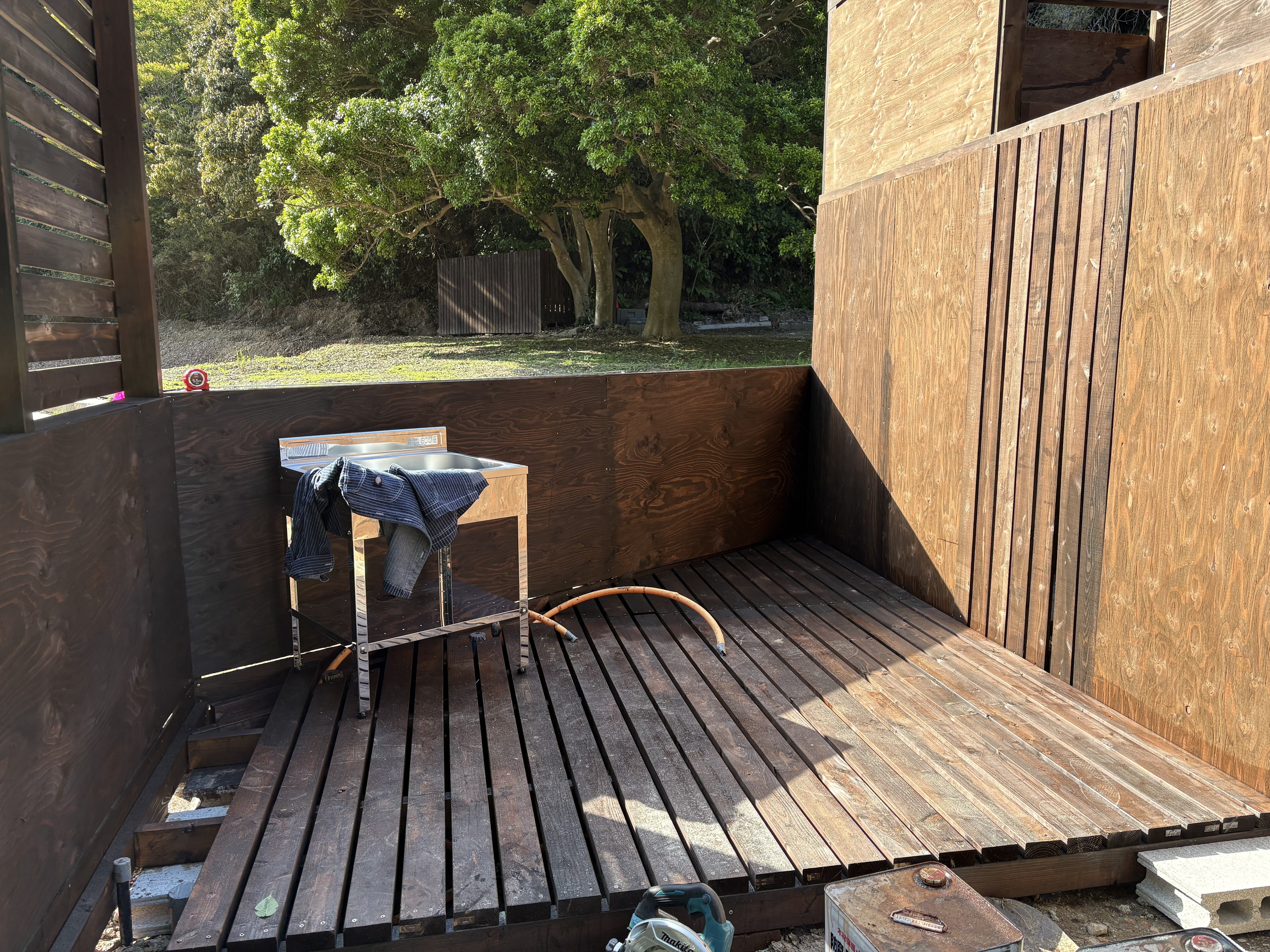 あと非常に申し訳ないのですが、施設作りが非常に遅れていて、今日やっと炊事場の床が9割がた出来たところです。トイレは男女ひとつずつ出来ております。シャワーは許可が必要な可能性が出てきたのと、私のスキルでは造作がかなり難儀で少し先になりそう… 車で5分ほどの所に温泉施設があるのでシャワーが必要な方はしばらくはそちらをご利用いただくことになりそうです。夏までにはどうにかしたいと思っています。