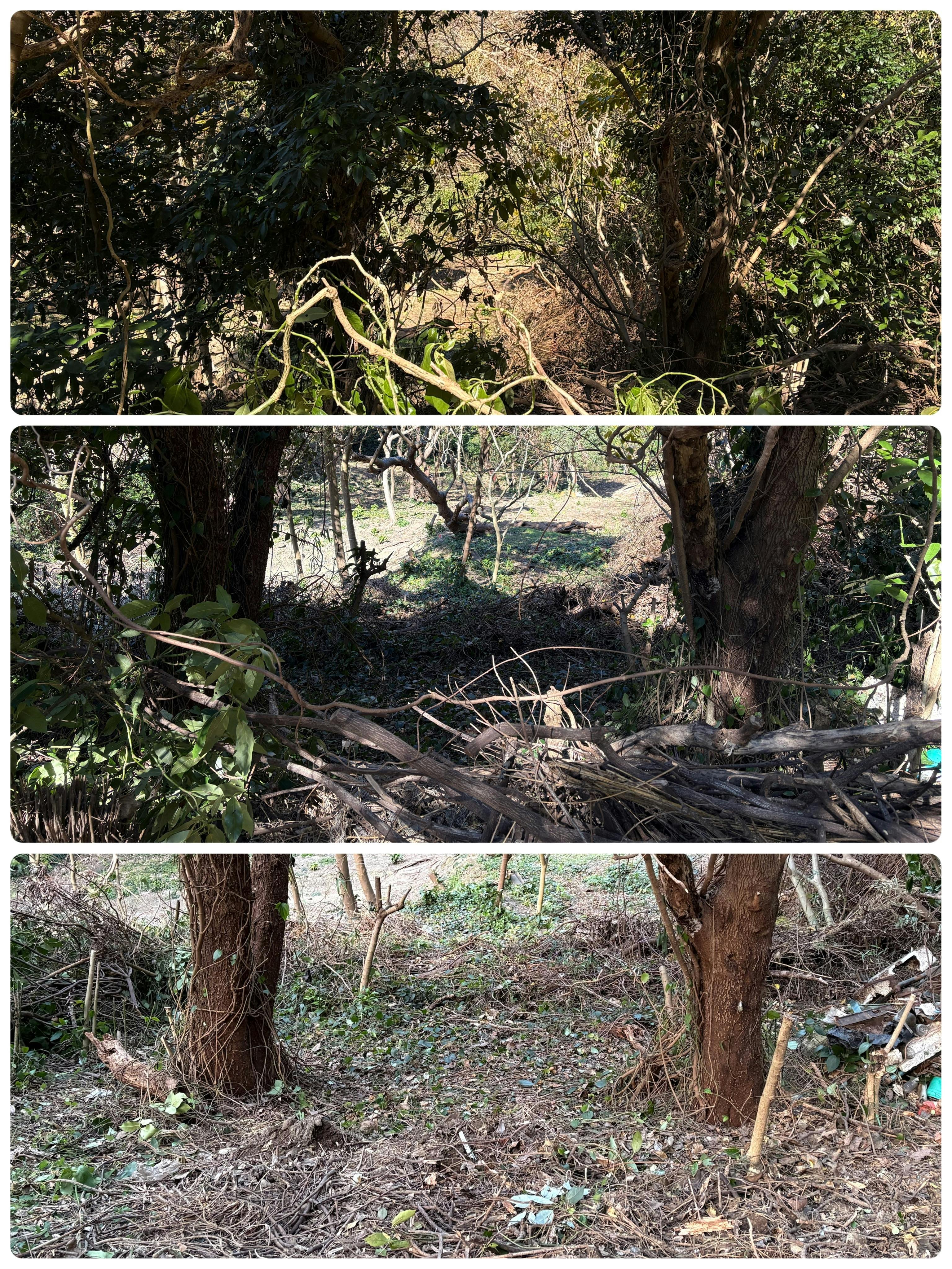 「そりゃあ欲しい」と思ったものの、シングルの身で簡単に決断できる話ではありません。それでも惹かれる心に蓋は出来ず、とりあえず一人でリサーチを始めました。真夏の炎天下、観音崎らしい大木がそびえる古い豊かな山ではありましたが、枯れた蔦が大木を支配、獣すら通れないほどの密集したブッシュ、放置すると厄介と名高い竹、山のような大量のコンクリート片、風呂桶や自転車、家庭ごみ、鉄くず……。次々に現れる不法投棄の山。分け入っても分け入ってもそれらに阻まれ土地の形すら把握できない日々。それでも興味と何かの縁を感じ、鎌を片手に毎日少しずつブッシュを切り拓いて行きました。