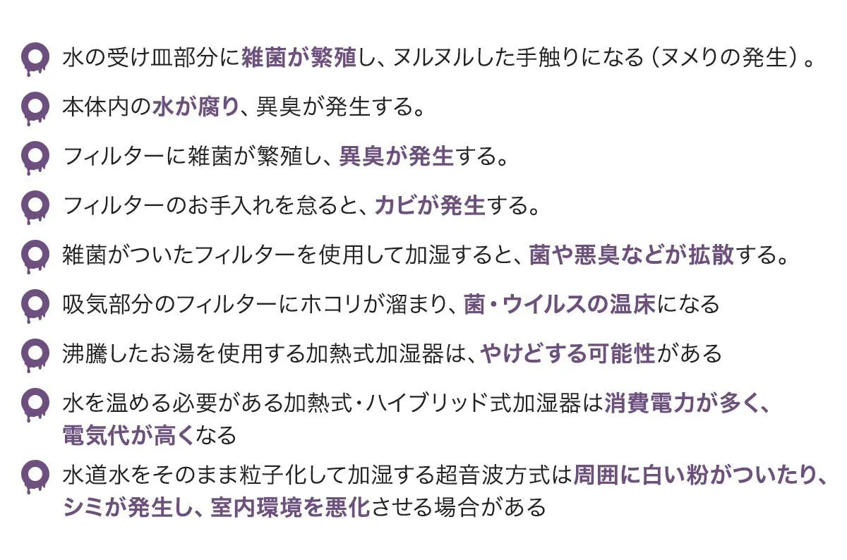 ●フィルターに雑菌が繁殖しないため、清潔な空気で加湿ができる