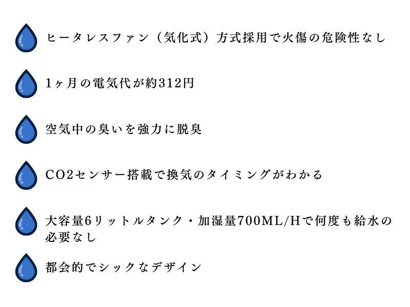 【POINT:ヒータレスファン(気化式)方式採用で火傷の危険性なし、電気代も安い】