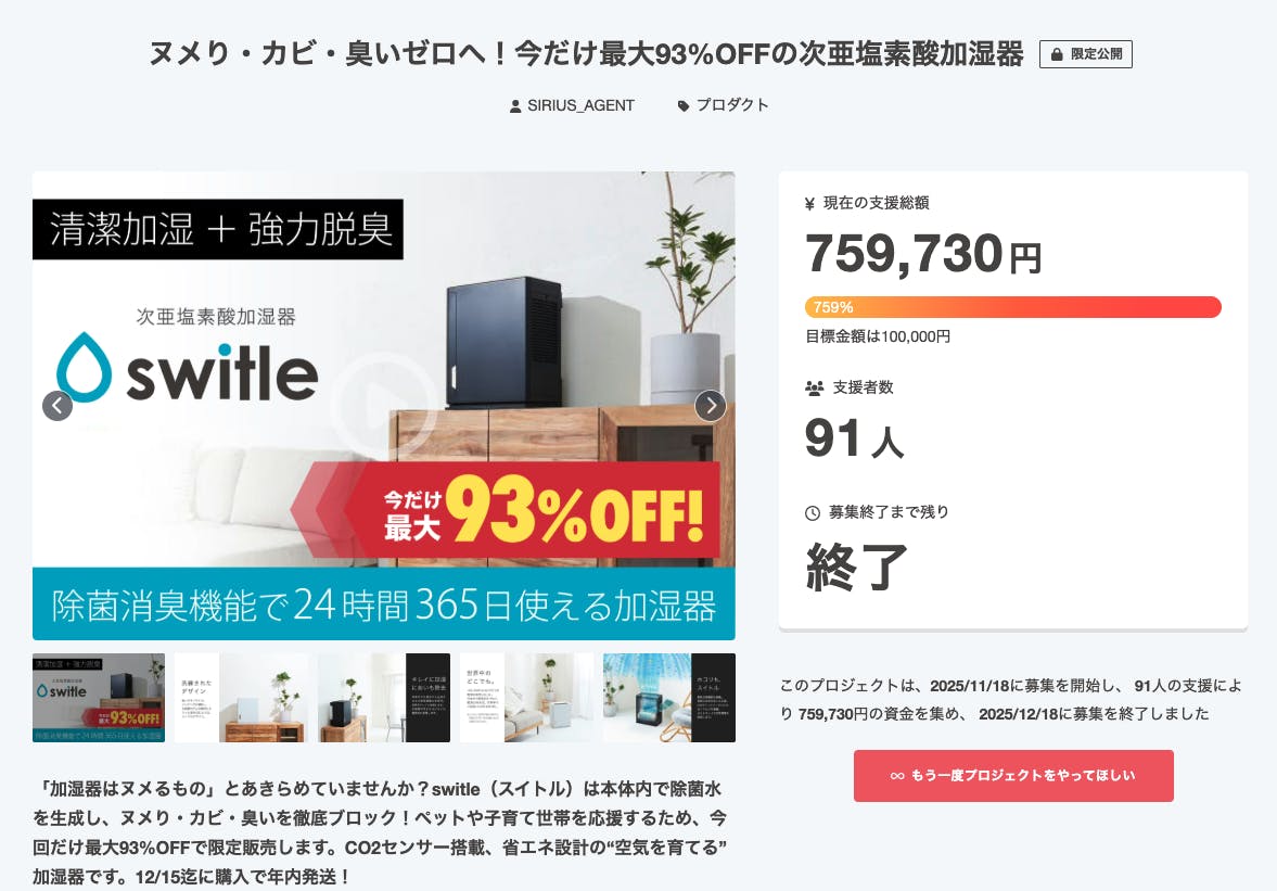 2025/12/19 12:43みなさんこんにちは、株式会社シリウスです!この度、次亜塩素酸気化式加湿器「switle moist(スイトル モイスト)」 のクラウドファンディングプロジェクトは、無事に終了いたしました。多くの皆さまからの温かいご支援・応援を賜り、当初の目標を大きく上回る結果でプロジェクトを終えることができました。心より御礼申し上げます。プロジェクト開始当初は、不安もありましたが、支援時に添えていただいたメッセージやコメント一つひとつが、私たちにとって大きな励みとなり、最後まで走り切る原動力となりました。「清潔な加湿環境を、もっと手軽に」そんな想いから開発した switle moist が、多くの方に共感していただけたことを、大変嬉しく思っております。【リターン品発送について】現在、リターン品のお届けに向けて、検品・発送準備を順次進めております。12月22日(月)より発送予定となります。年末年始の物量状況によっては、通常のお届け日数よりお届けが遅延する可能性もございます。あらかじめご了承いただきますようお願い申し上げます。なお、発送が完了後には、活動レポートにてお知らせいたしますので、今しばらくお待ちいただきますようお願いいたします。改めまして、このプロジェクトを支えてくださった皆さまに、心より感謝申し上げます。今後とも、どうぞよろしくお願いいたします。 もっと見るプロジェクト終了まで【 残り12時間 !】