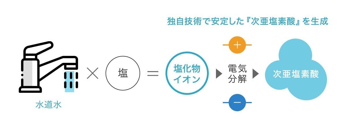 本体内部で生成する電解次亜塩素酸水を用いるため、