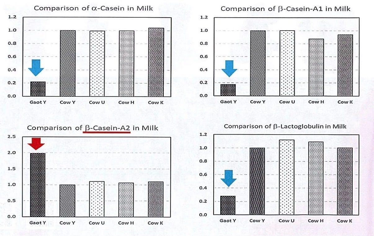 上の表は、やぎ乳(Gaot Y)といくつかの牛乳(Cow)のαガゼイン量の比較とヤギ乳に多かったβガゼインの中に含まれるA1、A2の2種類の含有量、βラクトグロブリンの含有量を比較したものです。