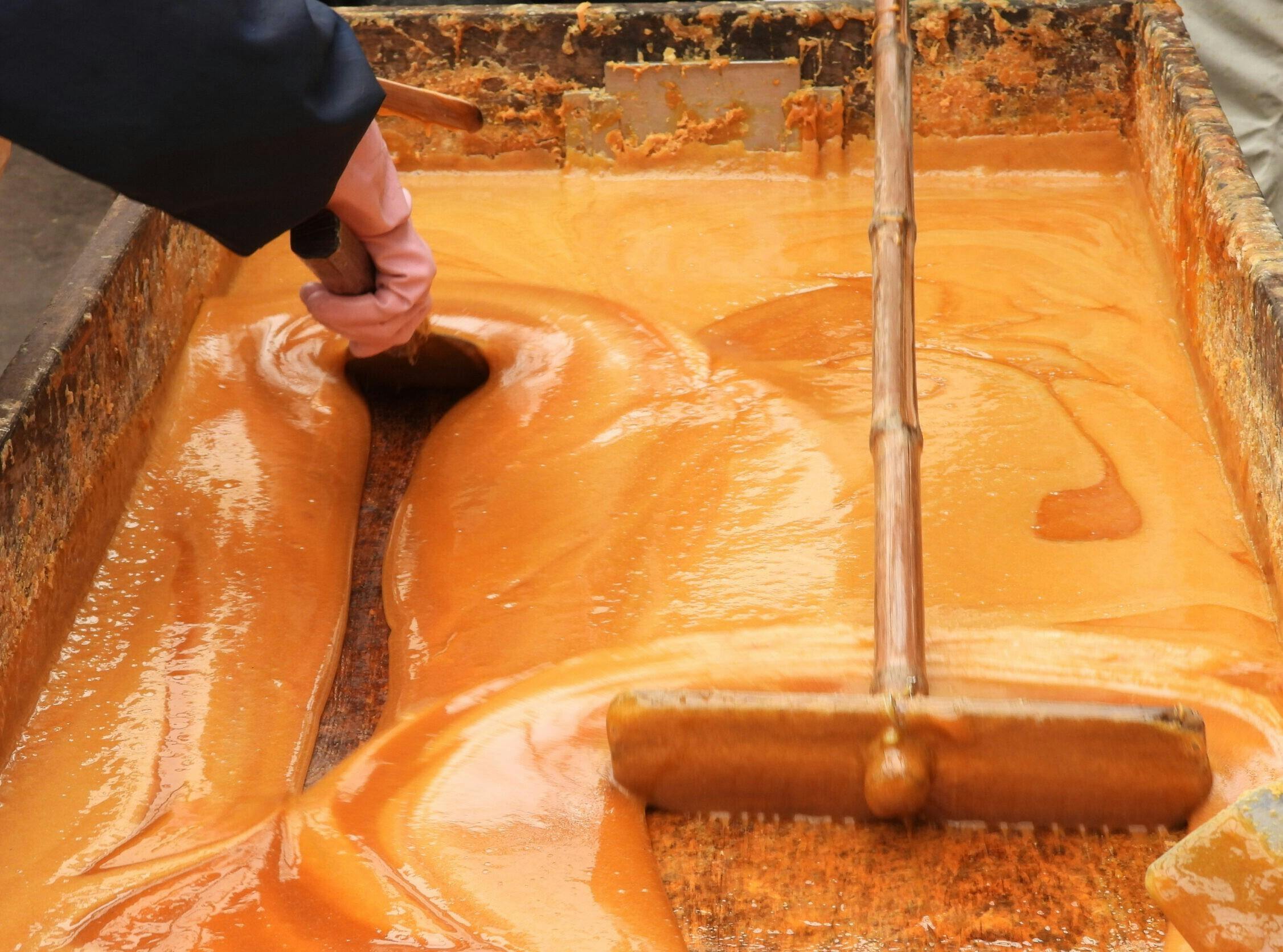 ヴィ-ガンの方や白糖はダメというお客さまのために、自社の畑でサトウキビを栽培し、黒糖づくりをおこなっています。苗の植え付けは3月から4月で、夏場は除草や水やりをし、12月に収穫をおこないます。サトウキビ用の特殊な釜を使って、先端の柔らかい部分を大事に削ぎ落します。それを束にして、精糖所へ持ち込み、搾汁→濃縮→平台に移して冷却→崩して粉状にし出来あがり。手作業は手間暇かかりますが、余分なものはいっさい使わない昔ながらの伝統的な作り方でサトウキビから黒糖をつくることで、普通の砂糖とは違う自然の甘さとなり、雑味のない美味しいジェラートが出来あがります。ぜひ、ご賞味ください♪