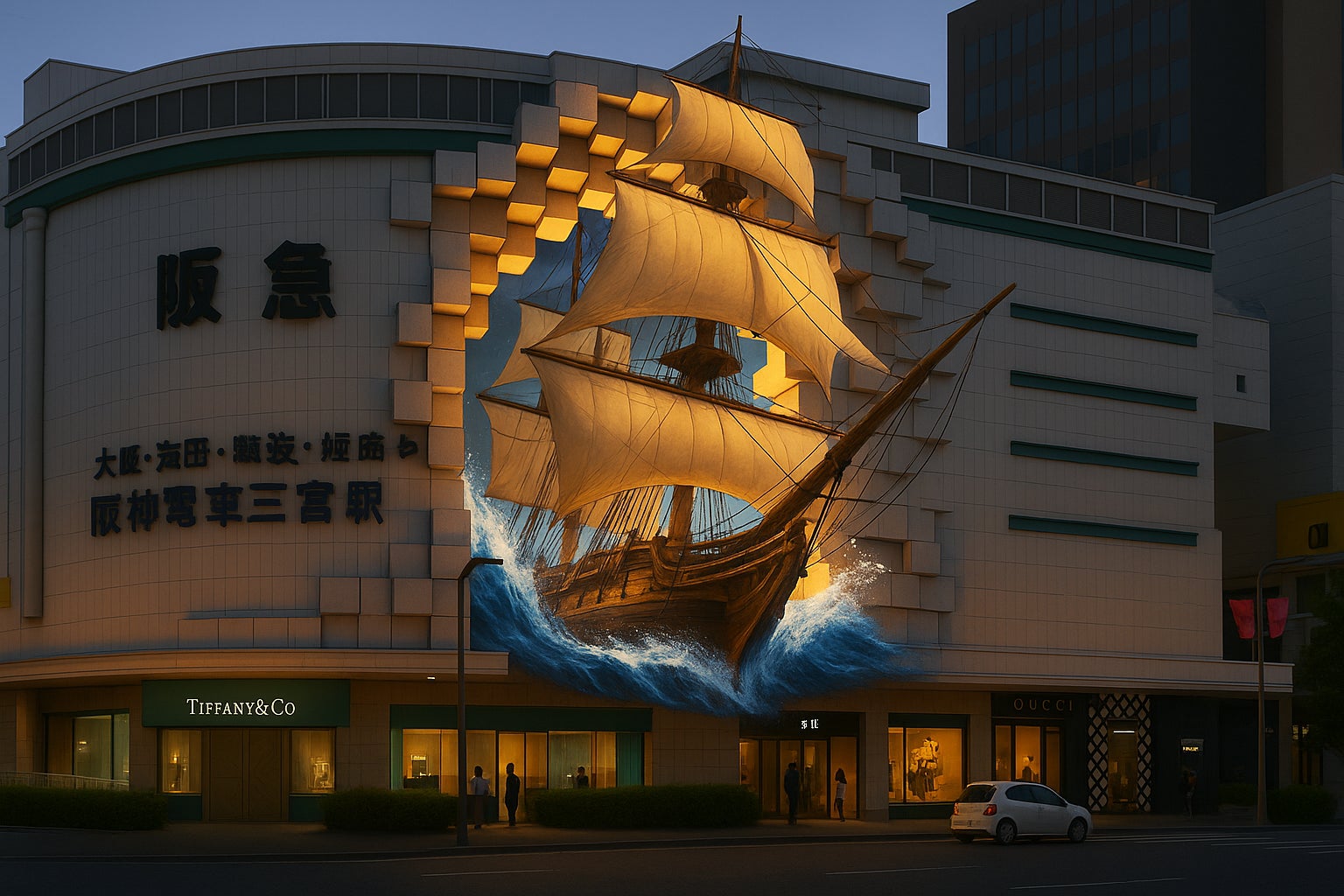 神戸阪急の壁面に生じたポータル奥に見えるのは、開国当初の神戸の沖合に浮かぶ帆船・蒸気船の数々であった。一隻の帆船が猛然と動き始め、ポータルの隙間から飛び出してきた。 ※イメージ画像