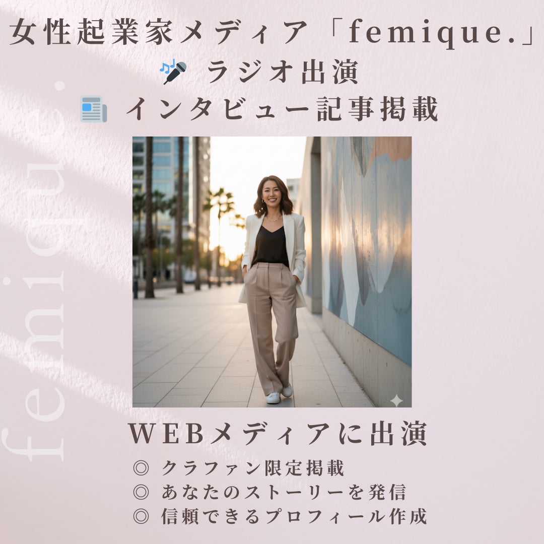 2026/03/06 12:00こんにちは。プロジェクトをご覧いただきありがとうございます。今回のクラウドファンディングの中で、とても特別なリターンがあります。それが新WEBメディア女性起業家のための「femique.」掲載権です。■ あなたの人生を「記事」として残すSNSでは投稿はすぐに流れてしまいます。しかし記事は残ります。・検索される・紹介される・プロフィールとして使える・信頼につながるつまりあなたの人生やビジネスの想いを社会に届ける「資産」になります。■ femique.とは「女性たちの生き方が世界を変える」をテーマに、女性起業家のリアルなストーリーをインタビュー形式で発信するWEBメディアです。日本経済新聞など複数のメディアでも紹介されています。■ 掲載内容このリターンでは・あなたの人生のストーリー・ビジネスに込めた想い・乗り越えてきた経験・これからのビジョンをインタビュー形式で記事にします。成功談だけではなく、迷いや葛藤も含めたリアルな物語を社会に届けます。■ こんな方におすすめ・自分の想いを言葉にして届けたい・活動を多くの人に知ってもらいたい・信頼できるプロフィール記事を作りたい・人生のストーリーを形に残したい■ 記事掲載までの流れ① 事前ヒアリング② インタビュー③ 記事制作④ WEB掲載あなたの想いを丁寧に言葉にして形にします。■ 最後に誰の人生にも語る価値のある物語があります。しかしそれを社会に届ける機会は多くありません。このリターンはあなたの人生と想いを記事として社会に届ける機会です。あなたのストーリーをぜひ届けてください。 もっと見る